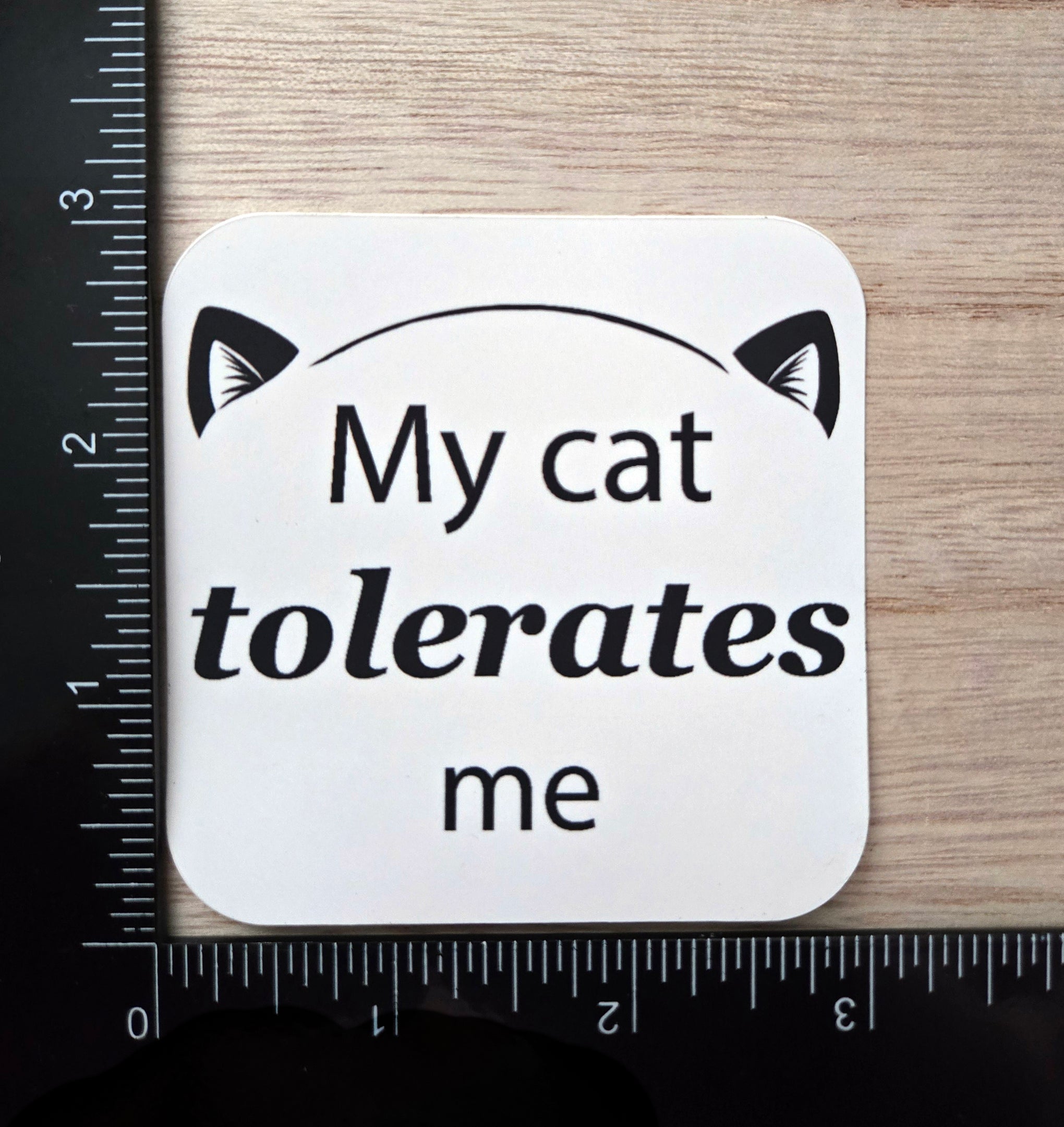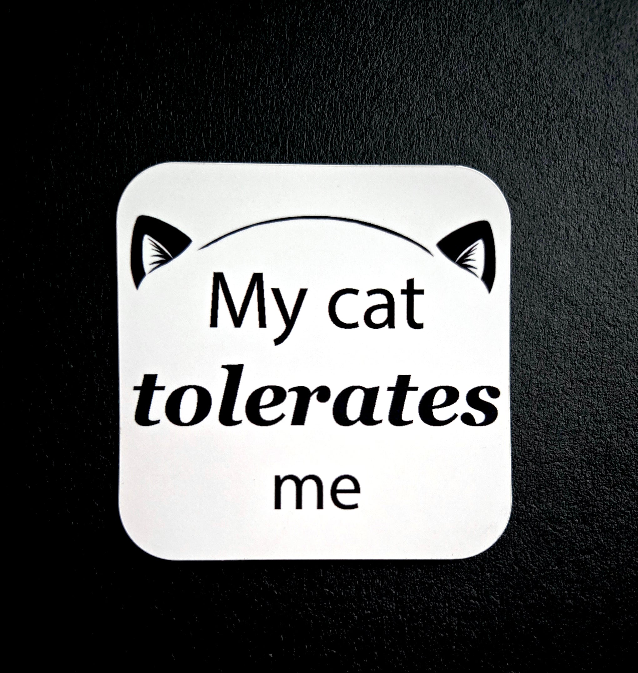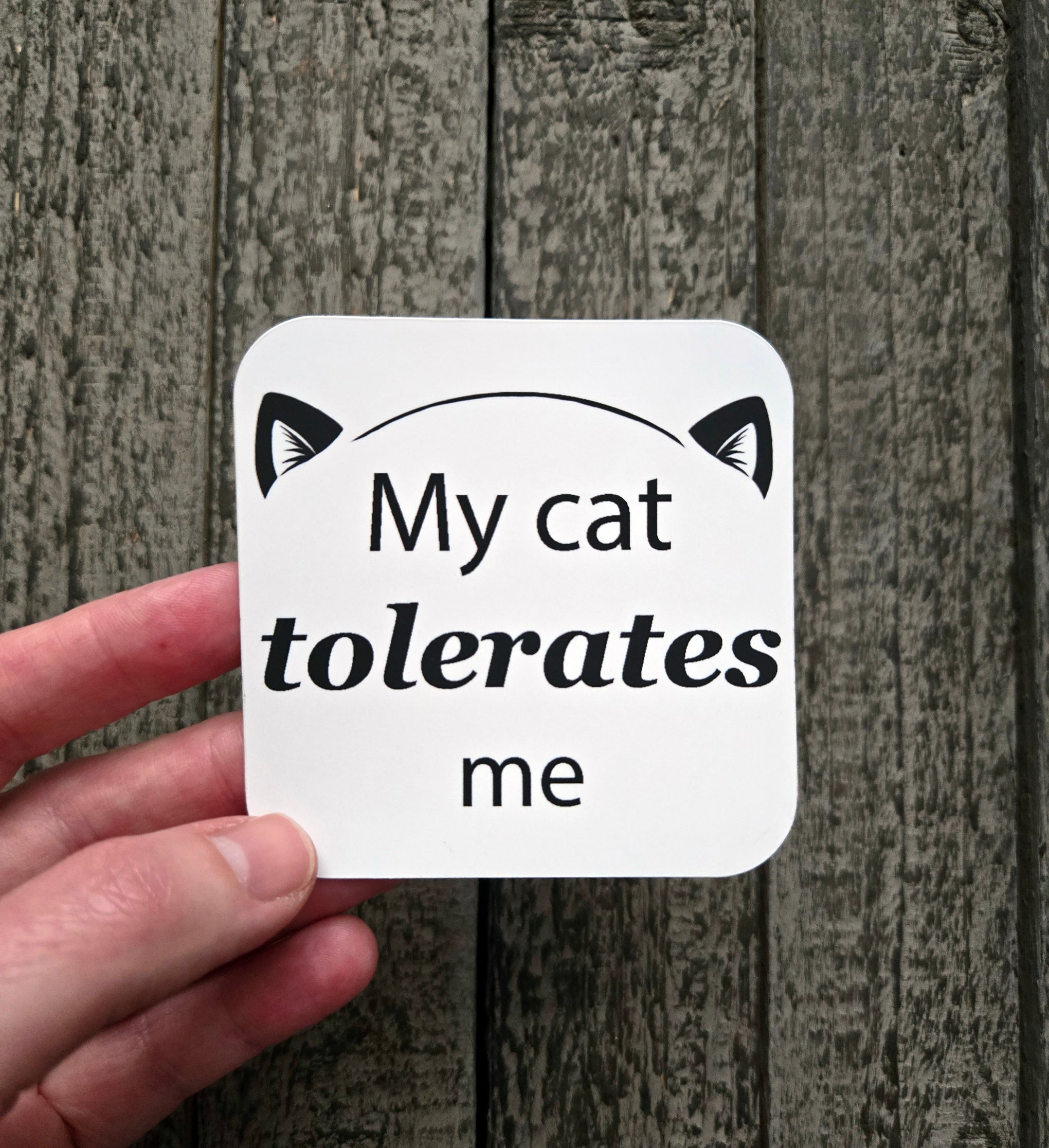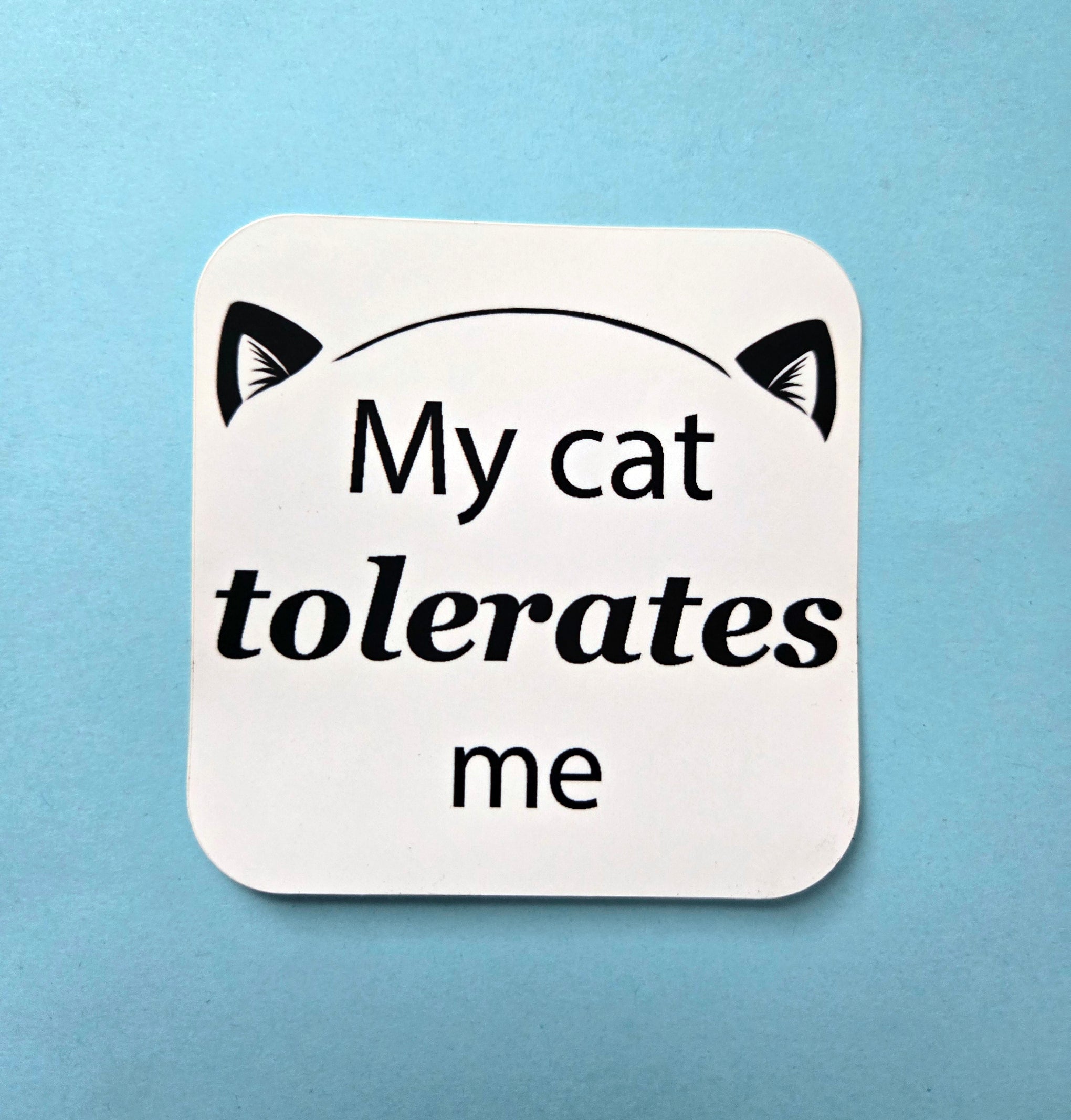 "My Cat Tolerates Me" sticker - Every cat owner knows the truth: cats barely tolerate us. This hilarious funny cat sticker features "My cat tolerates me" with adorable cat ears peeking over the text in a charming, simple design. This waterproof vinyl sticker is perfect for laptops, water bottles, planners, journals, phone cases, or any surface that needs a dose of feline truth. It perfectly captures the reality of living with our feline overlords.