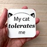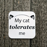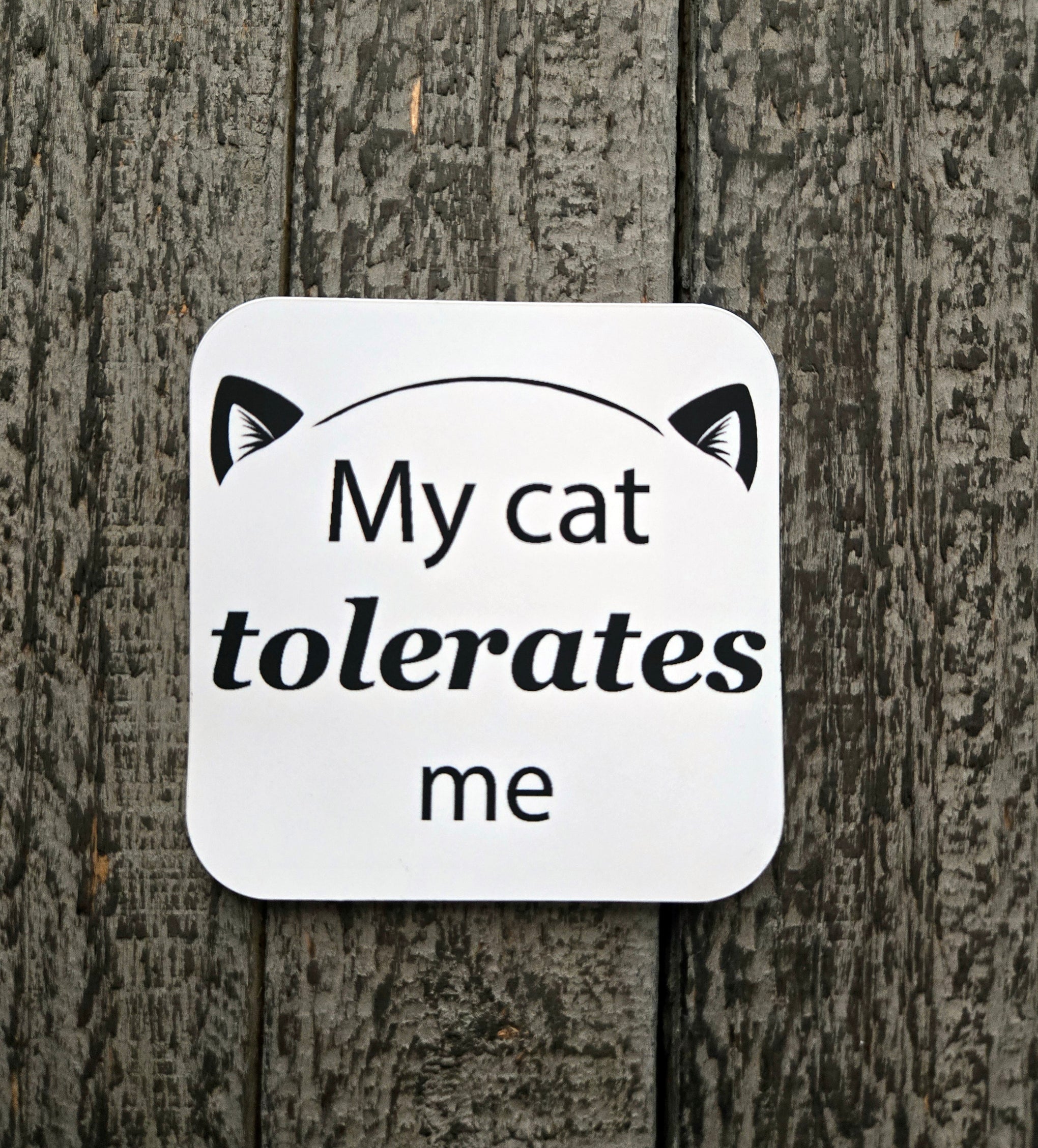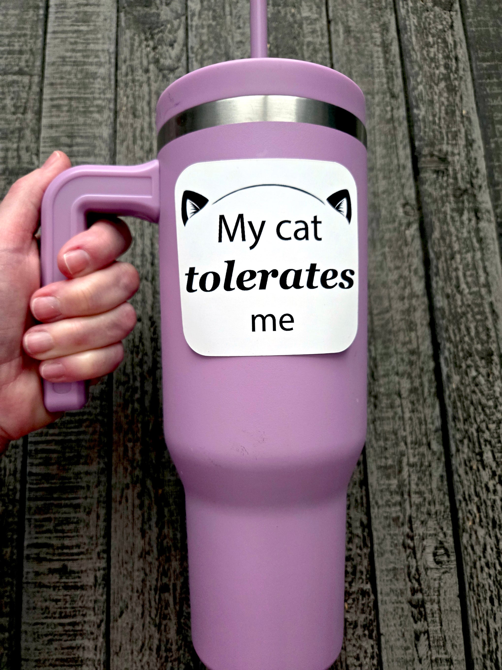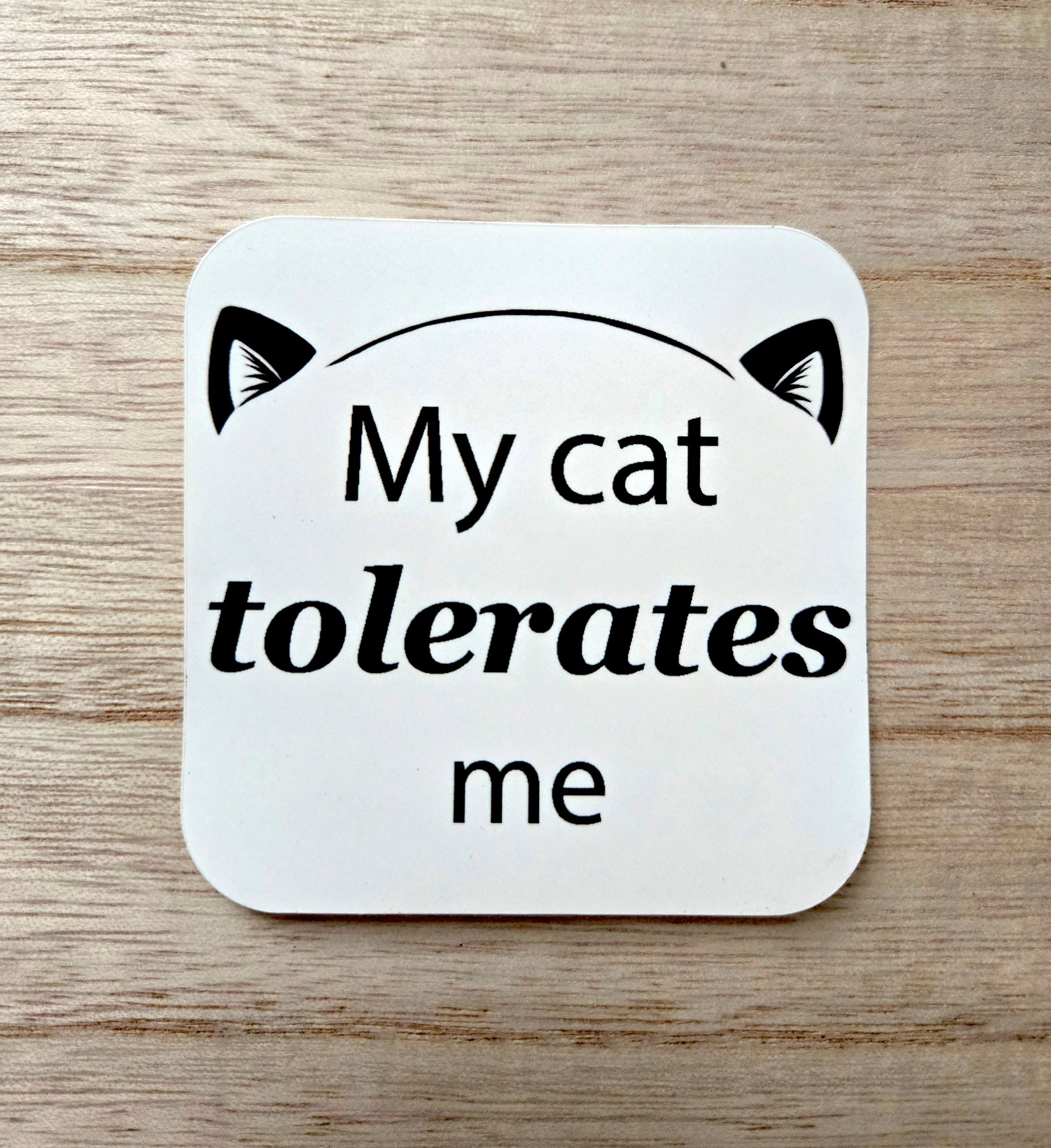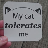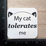 "My Cat Tolerates Me" sticker - Every cat owner knows the truth: cats barely tolerate us. This hilarious funny cat sticker features "My cat tolerates me" with adorable cat ears peeking over the text in a charming, simple design. This waterproof vinyl sticker is perfect for laptops, water bottles, planners, journals, phone cases, or any surface that needs a dose of feline truth. It perfectly captures the reality of living with our feline overlords.