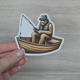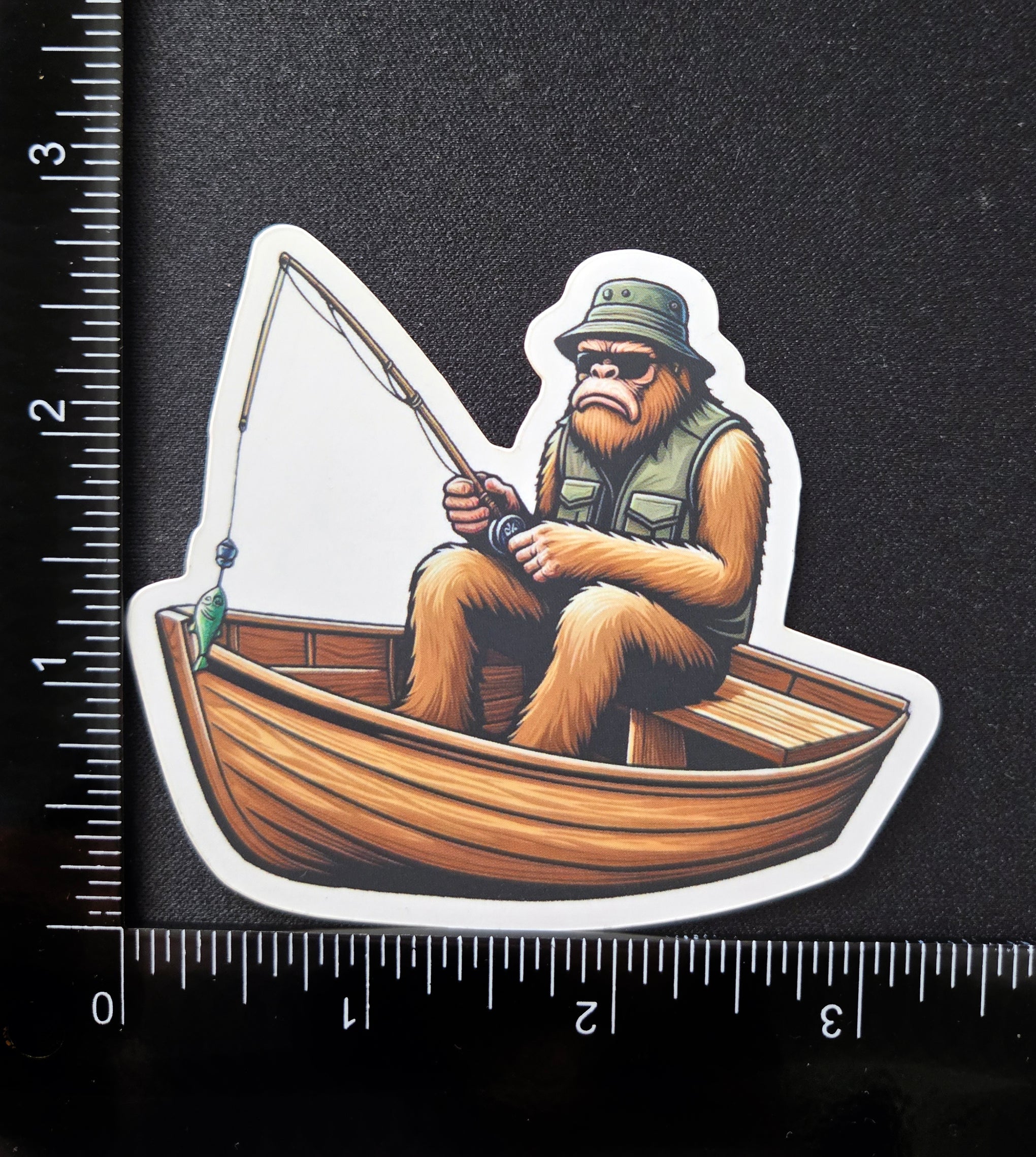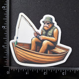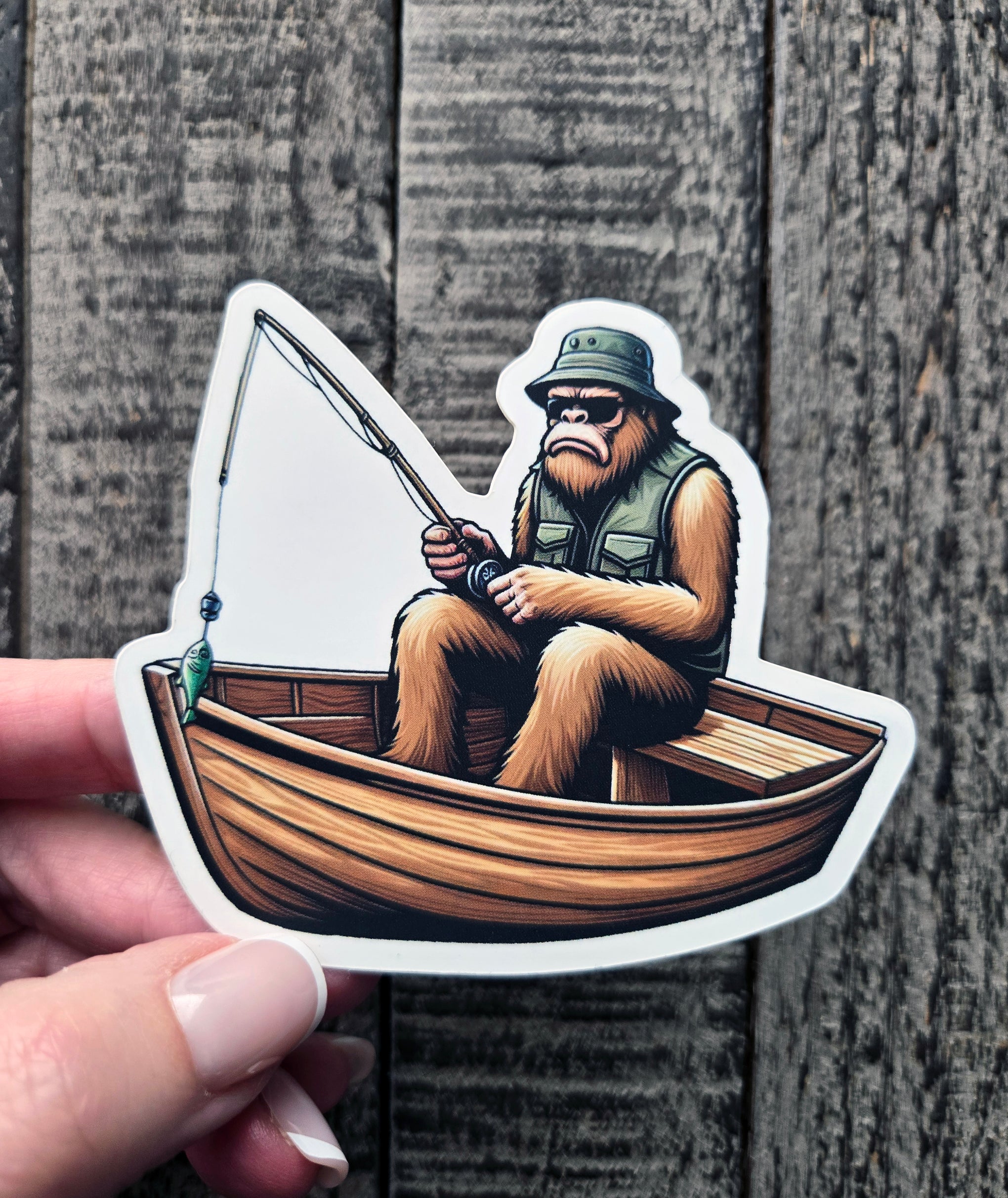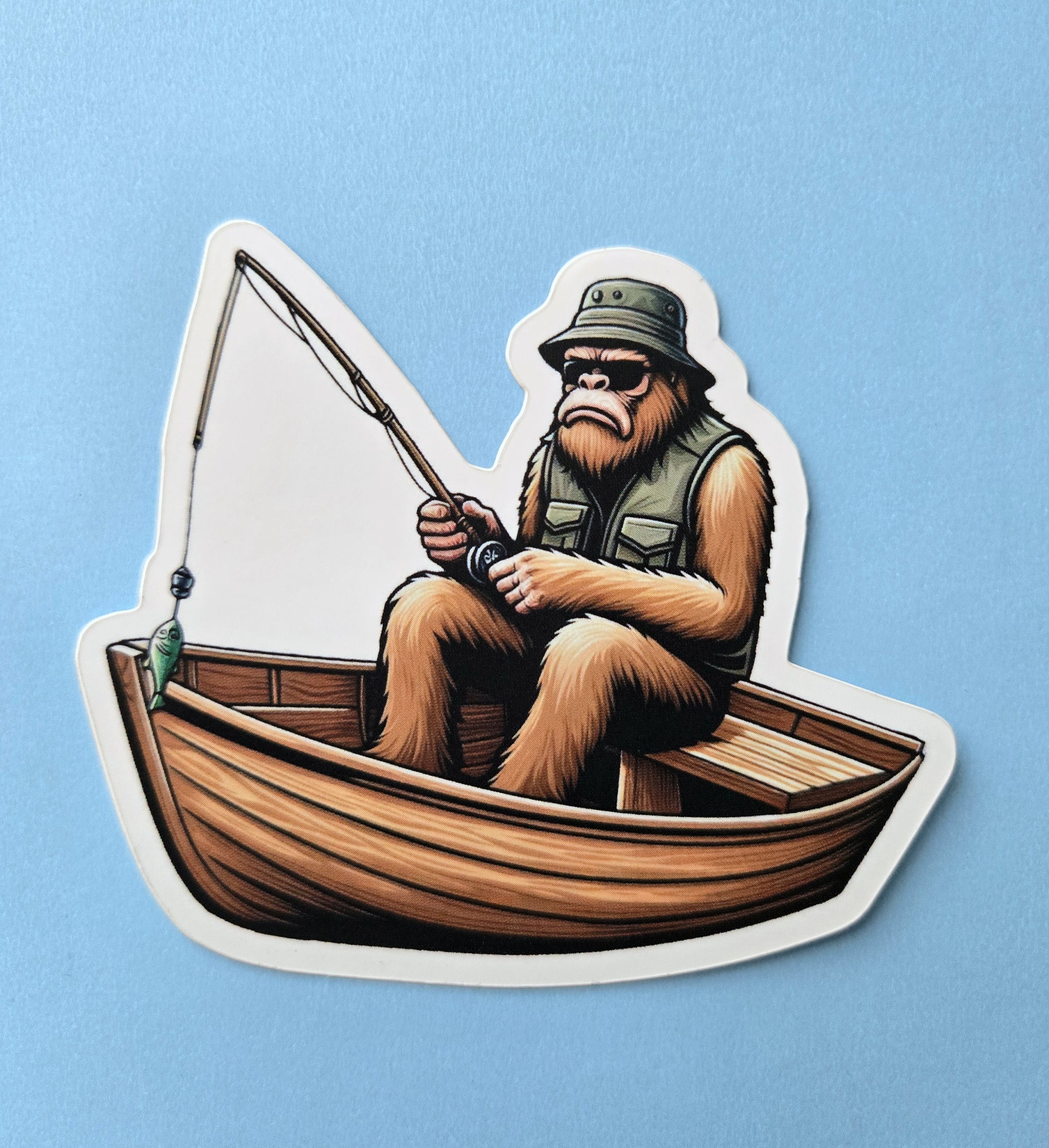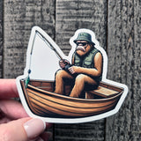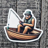 Fisherman Bigfoot - Add some whimsical wilderness charm to your collection with this unique vinyl sticker featuring a grumpy yet adorable Bigfoot enjoying a peaceful day of fishing! This detailed design showcases a furry fisherman dressed in a bucket hat and fishing vest, sitting in a wooden rowboat with his fishing rod cast.