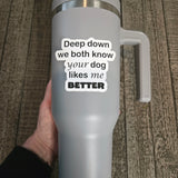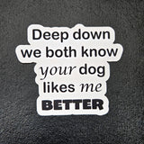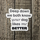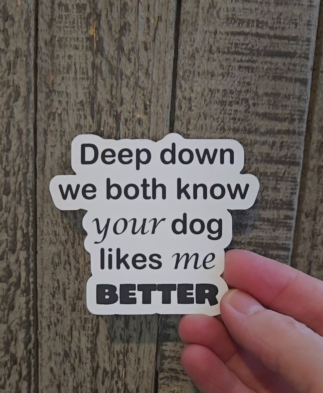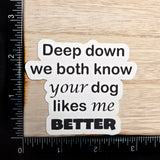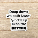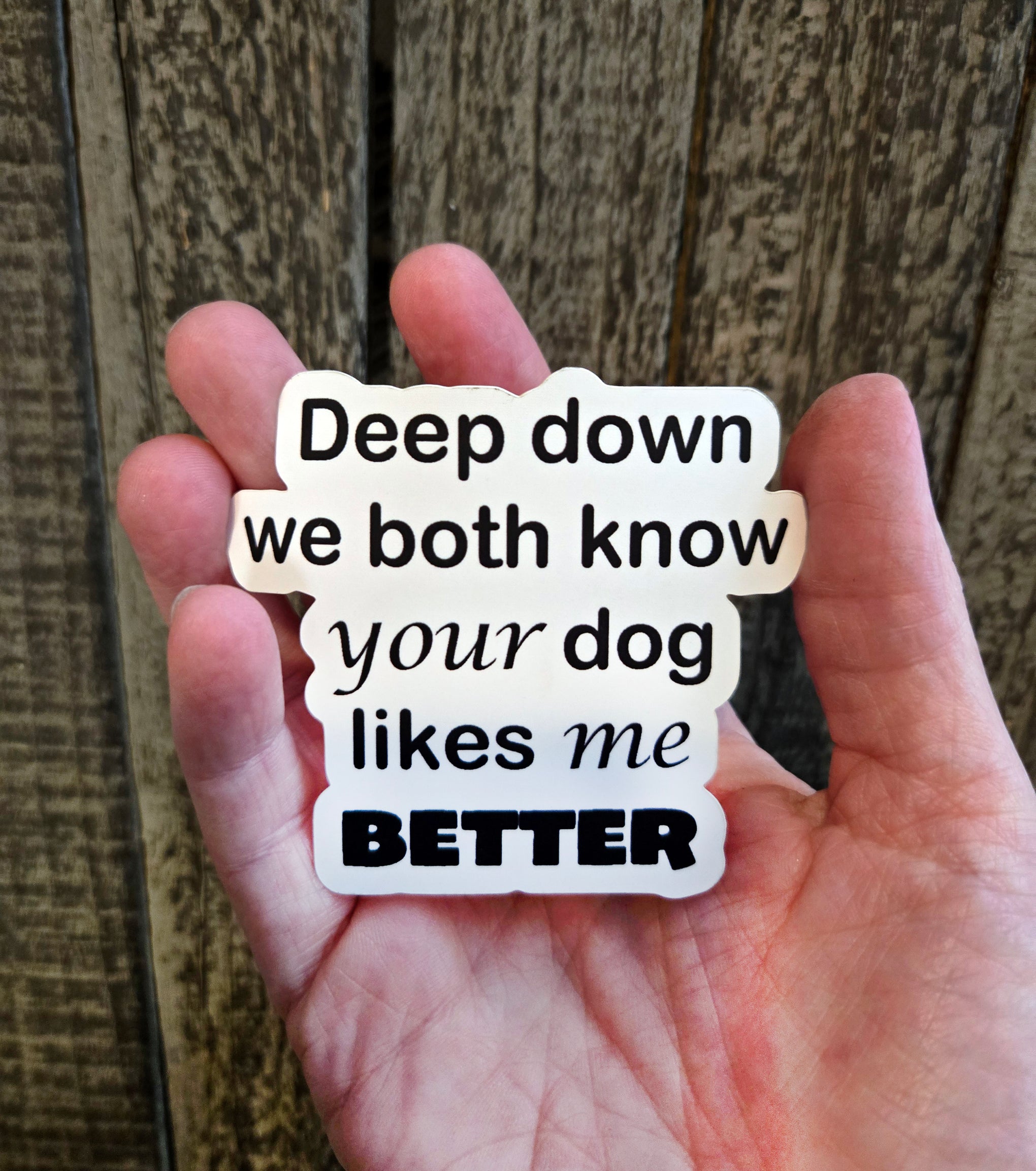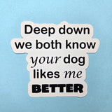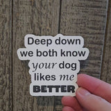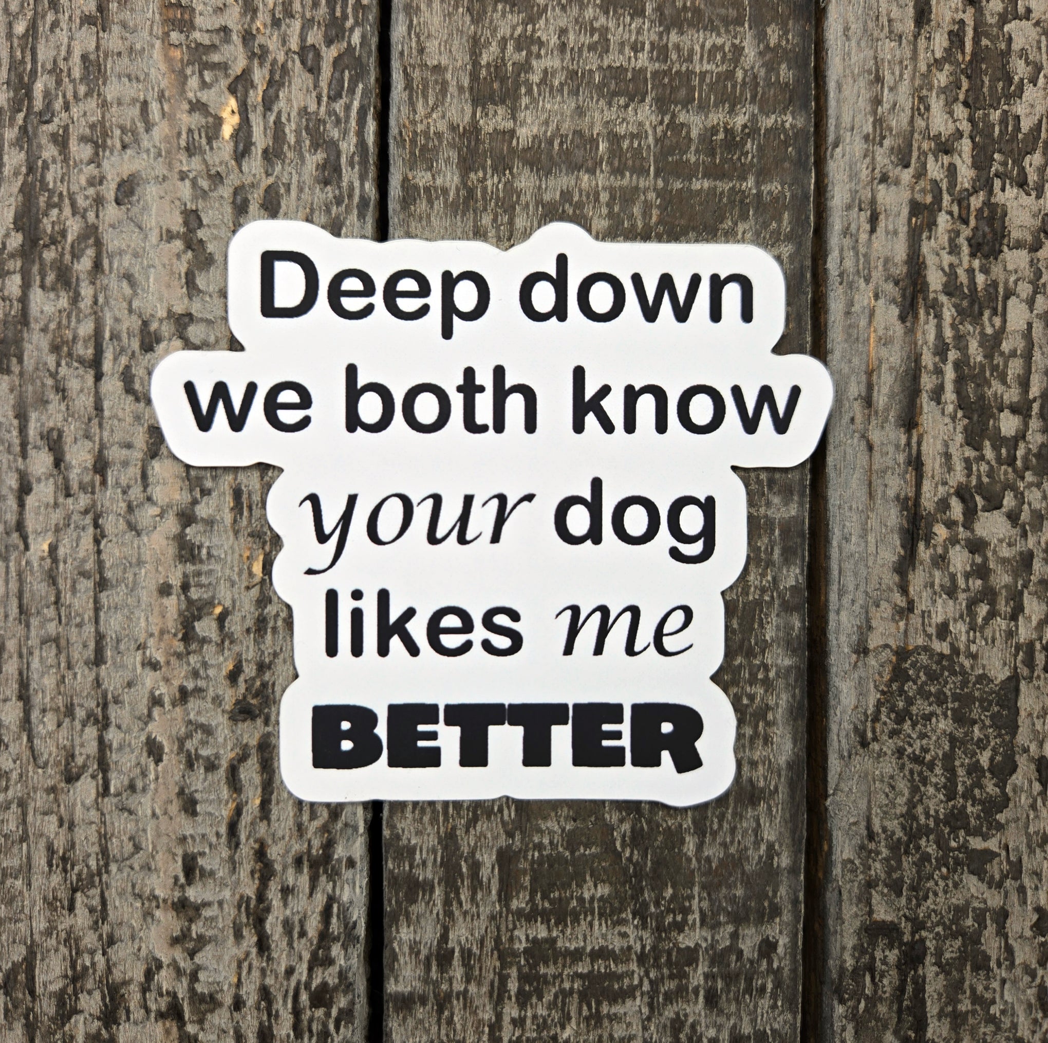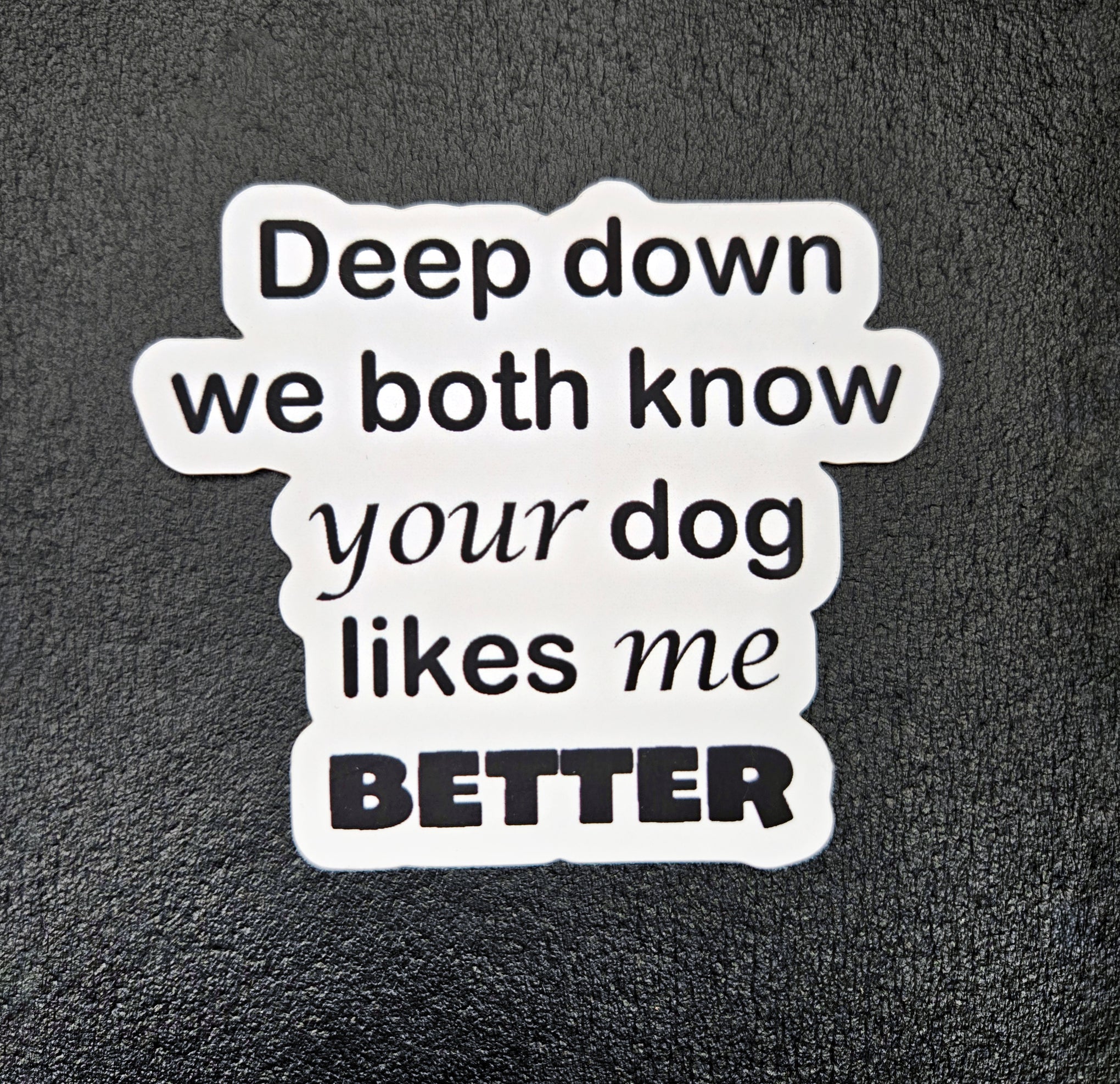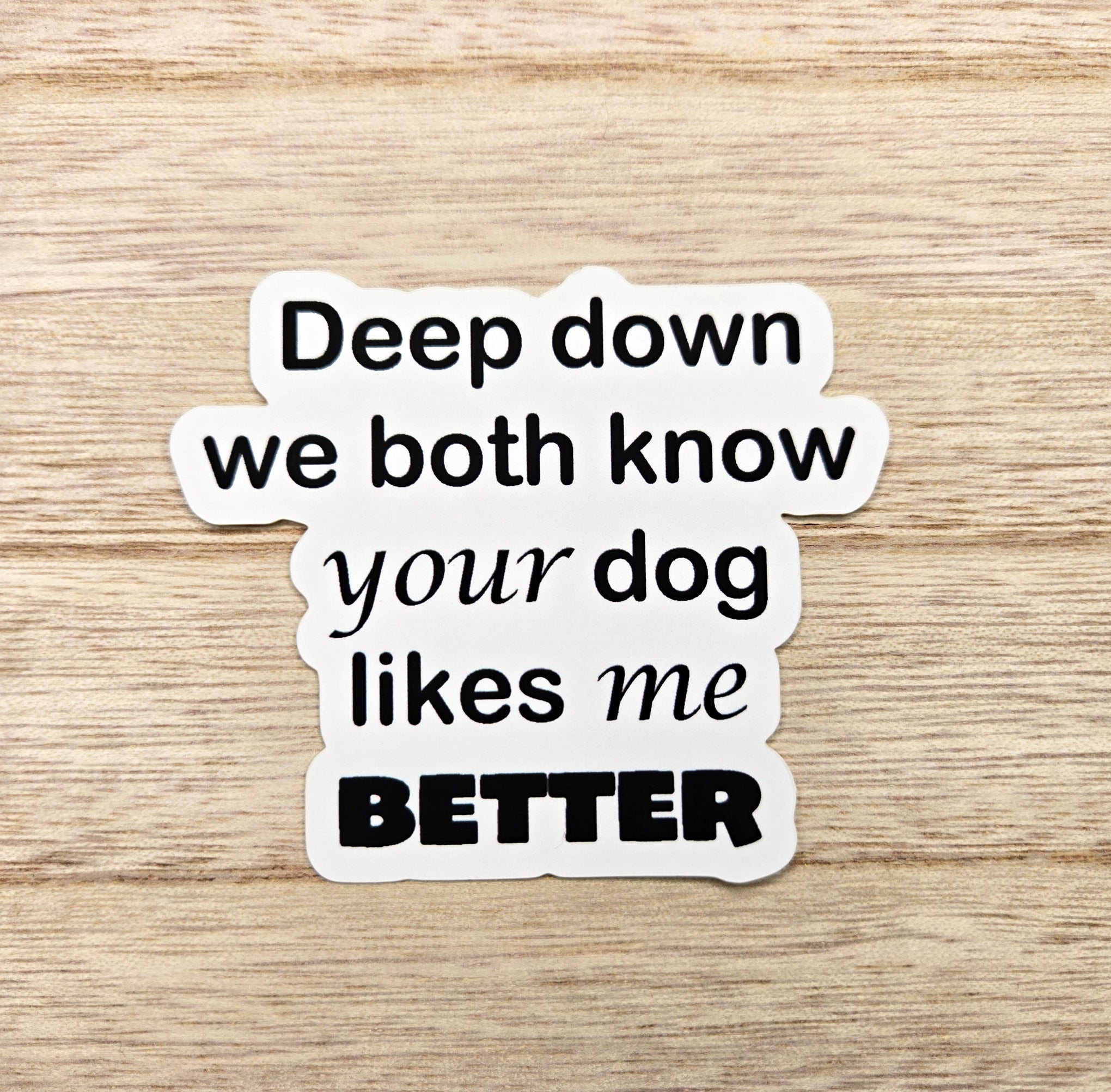 Funny dog sticker with sarcastic humor: "Deep down we both know your dog likes me BETTER" It's the perfect gift for dog lovers, dog moms, and dog dads who know they're the favorite human! This waterproof vinyl decal brings dog humor to laptops, water bottles, notebooks, and more.