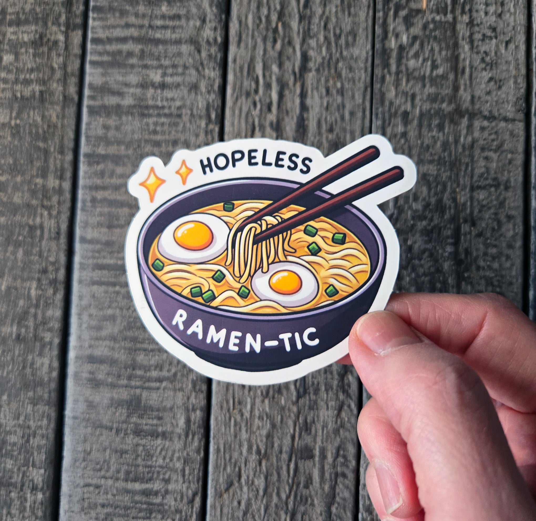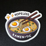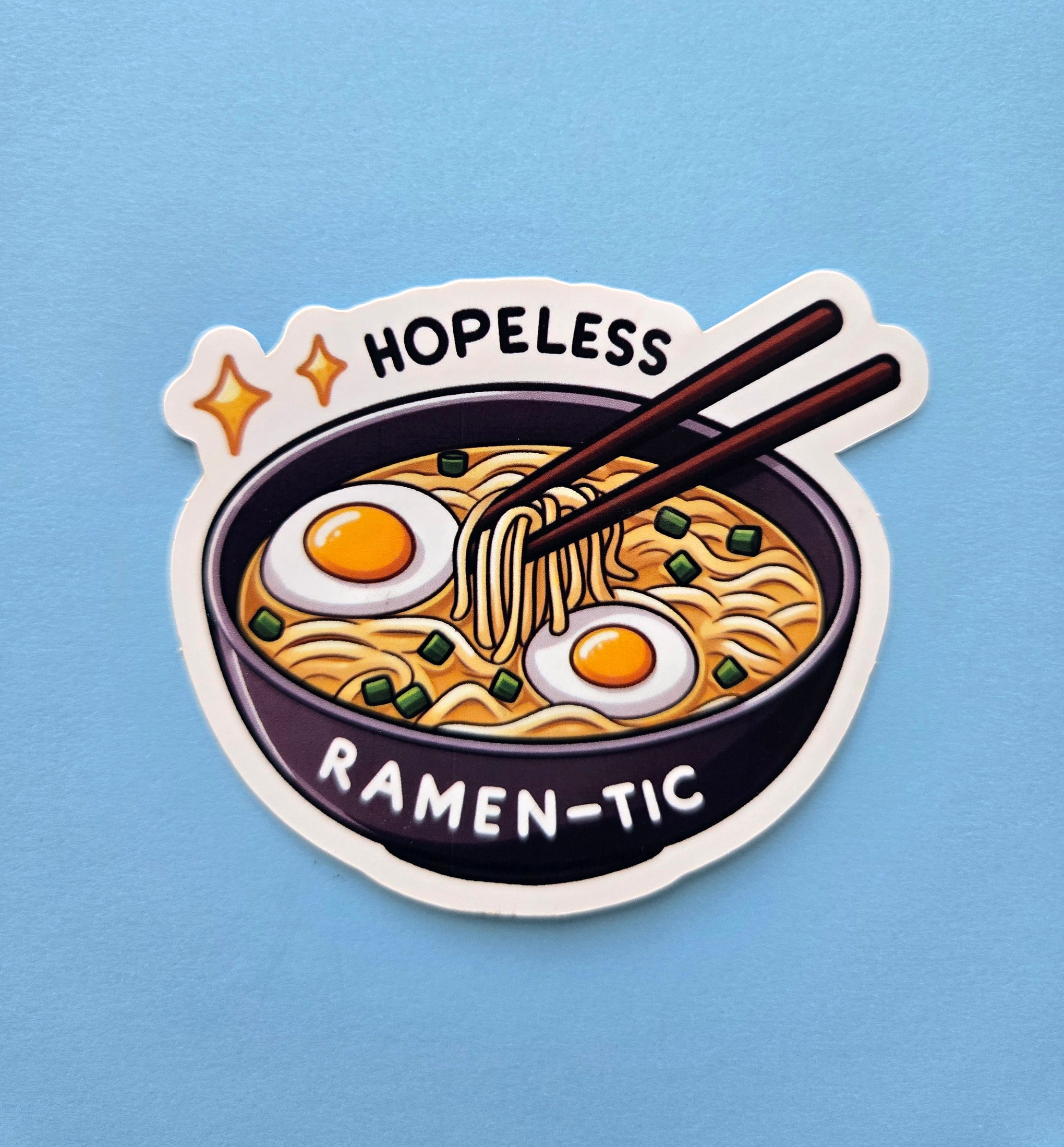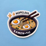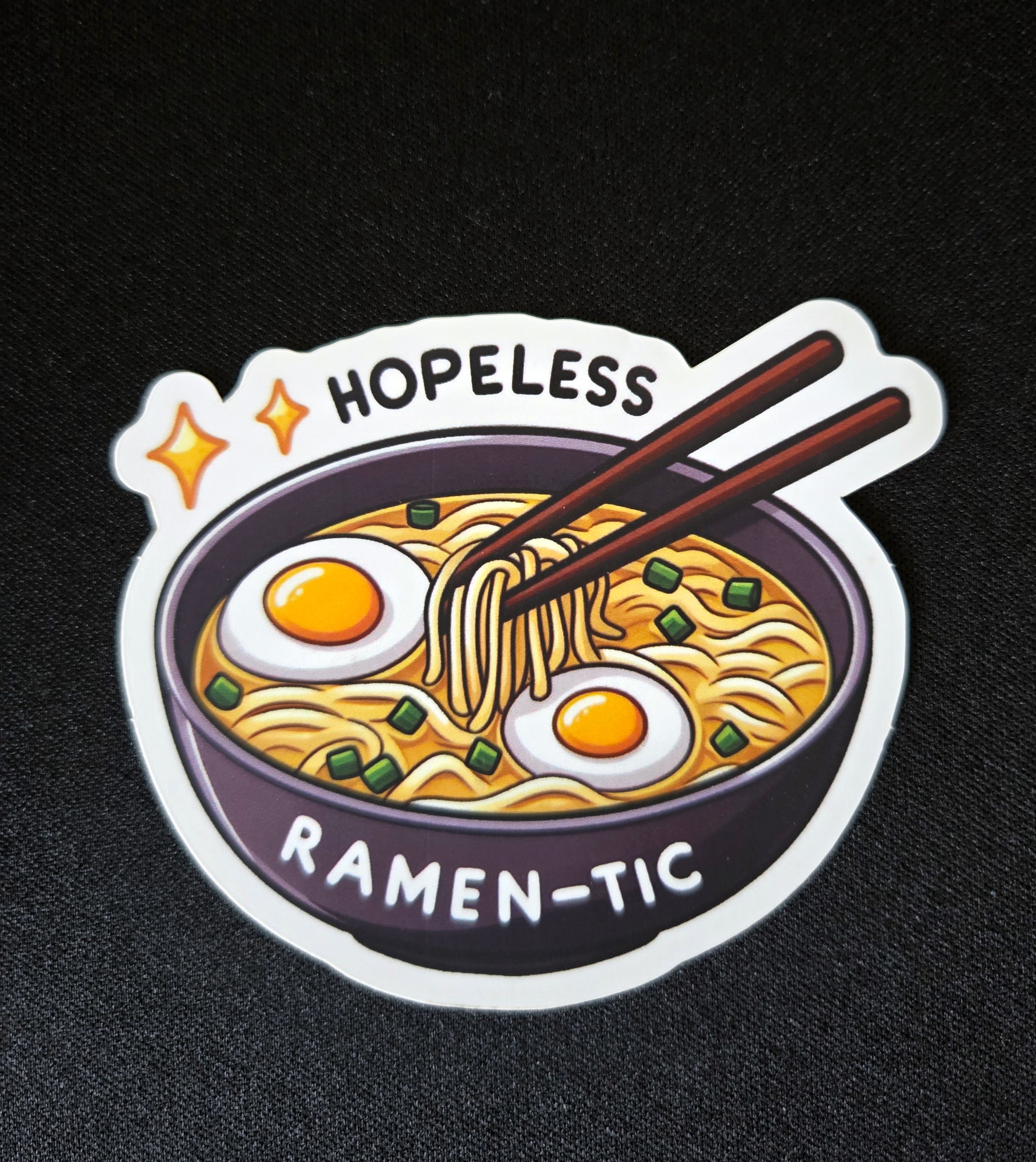Hopeless Ramen-Tic - This adorable ramen bowl vinyl sticker celebrates the beautiful relationship between you and your go-to comfort food. Complete with perfectly soft-boiled eggs, fresh scallions, and those golden noodles that never let you down, it's a love story that's always satisfying. Made from premium waterproof vinyl with a durable matte finish.