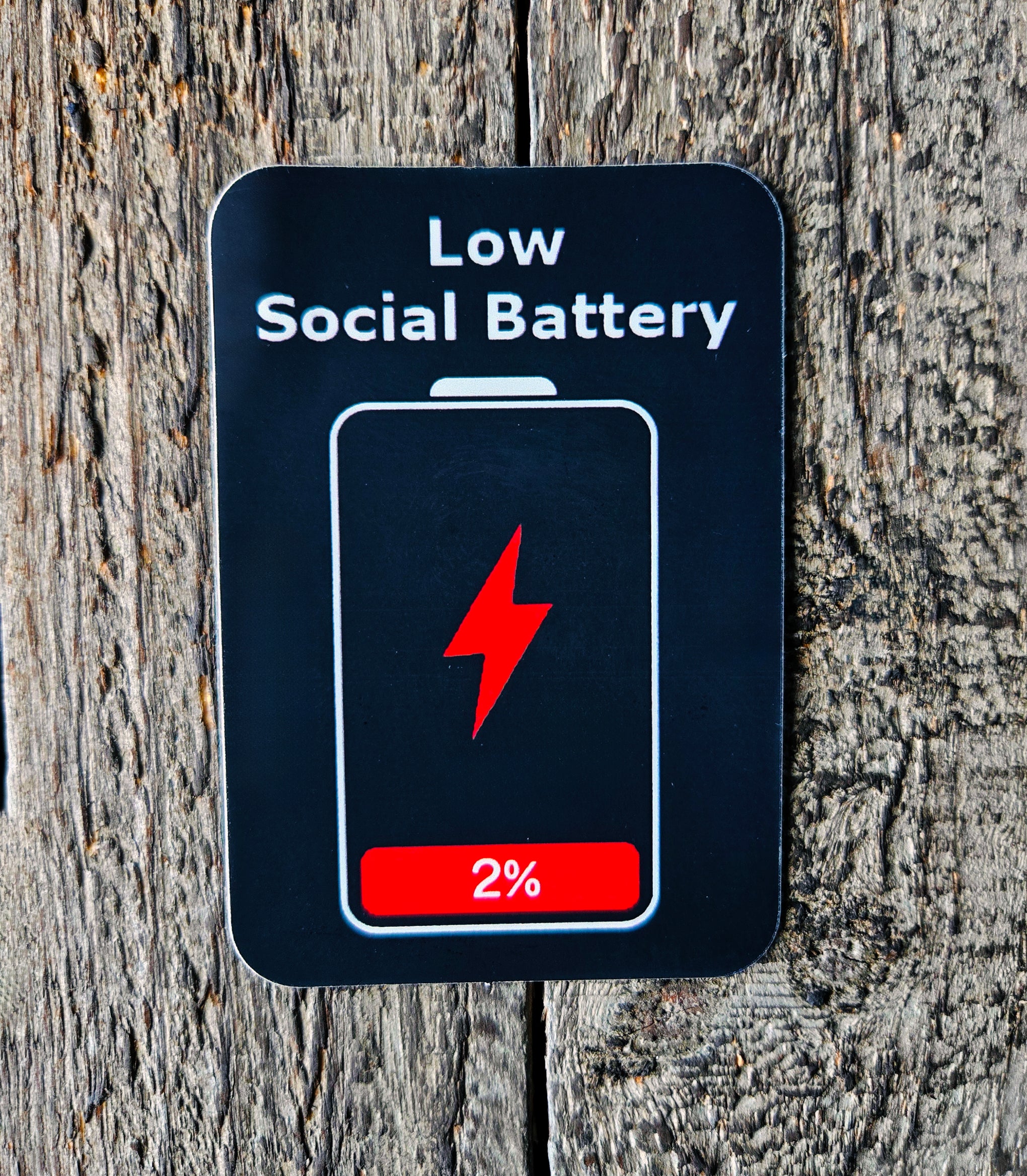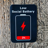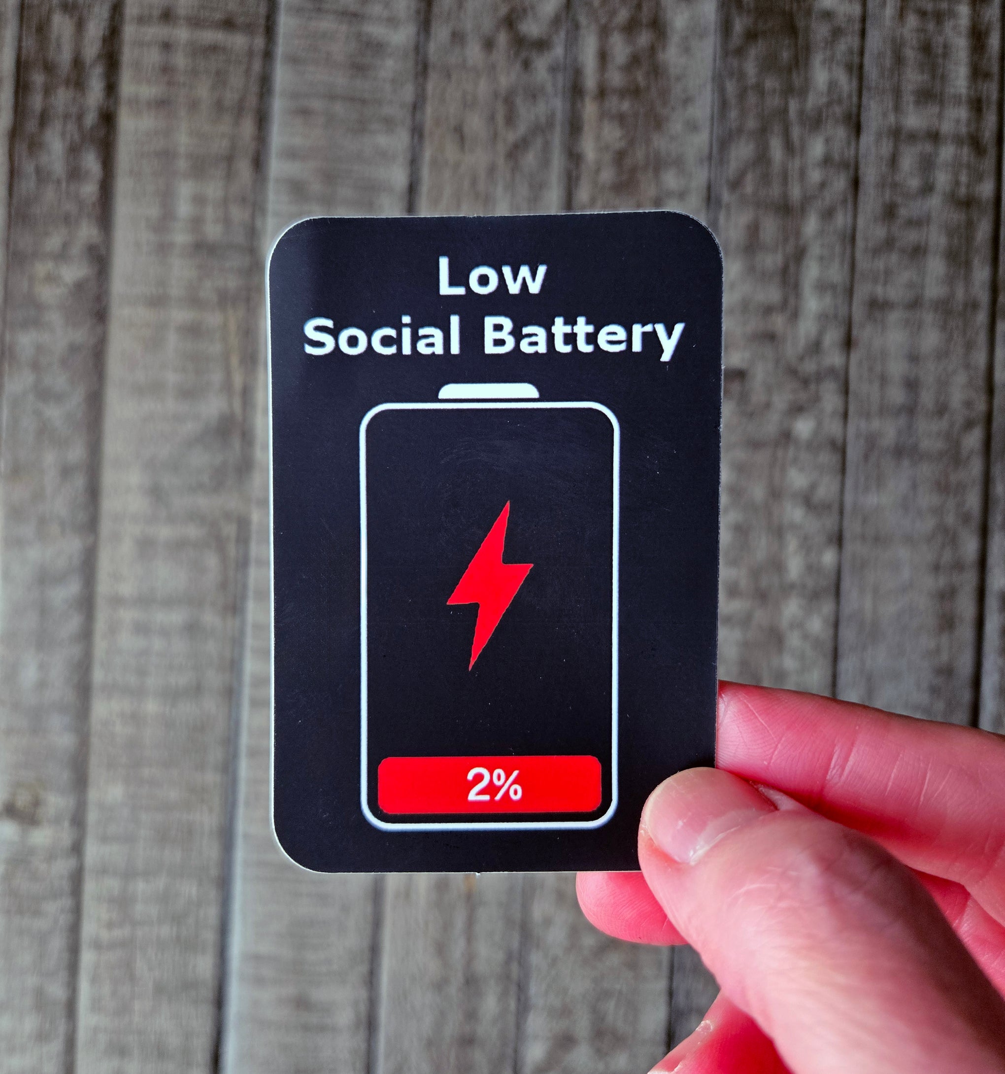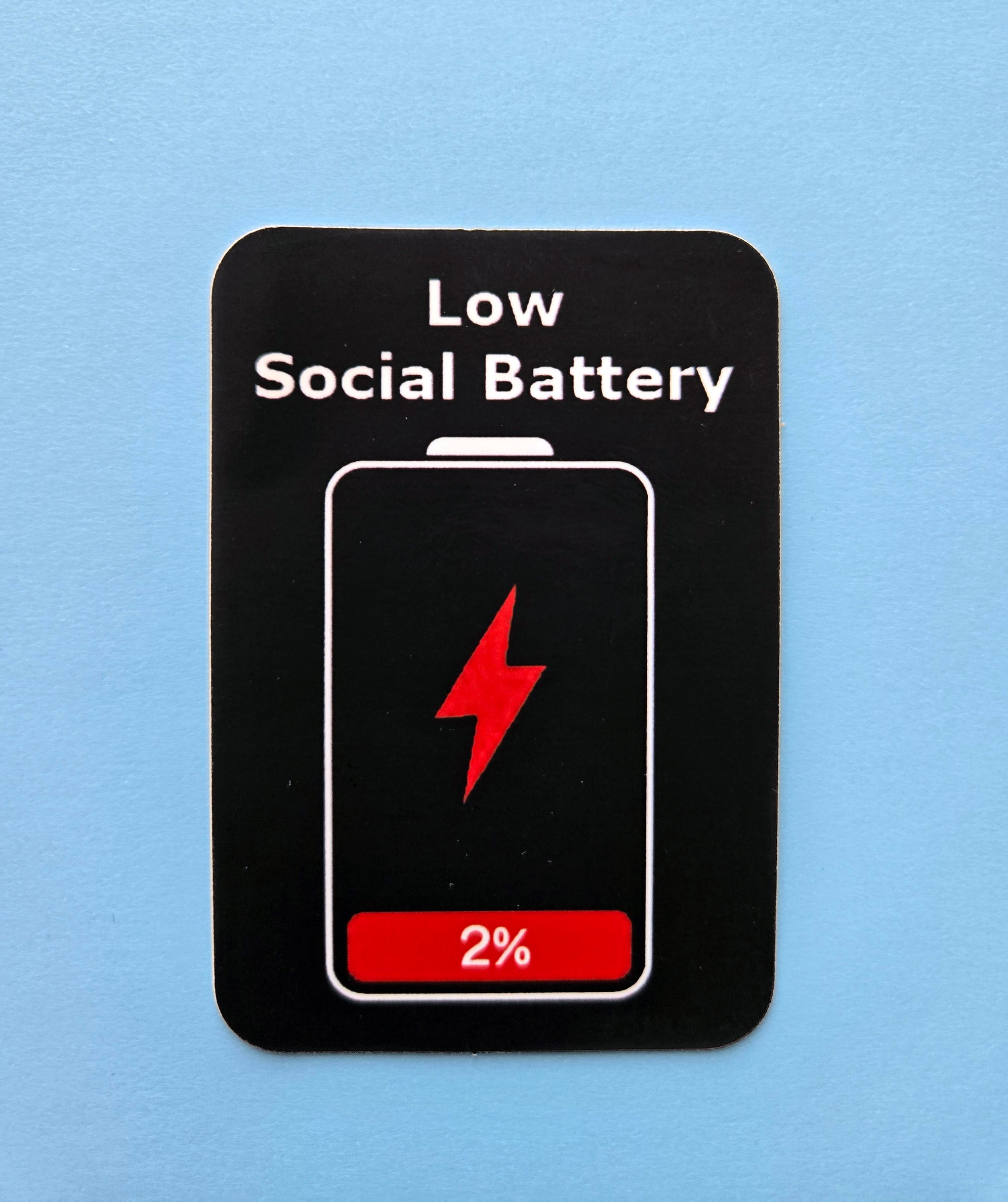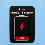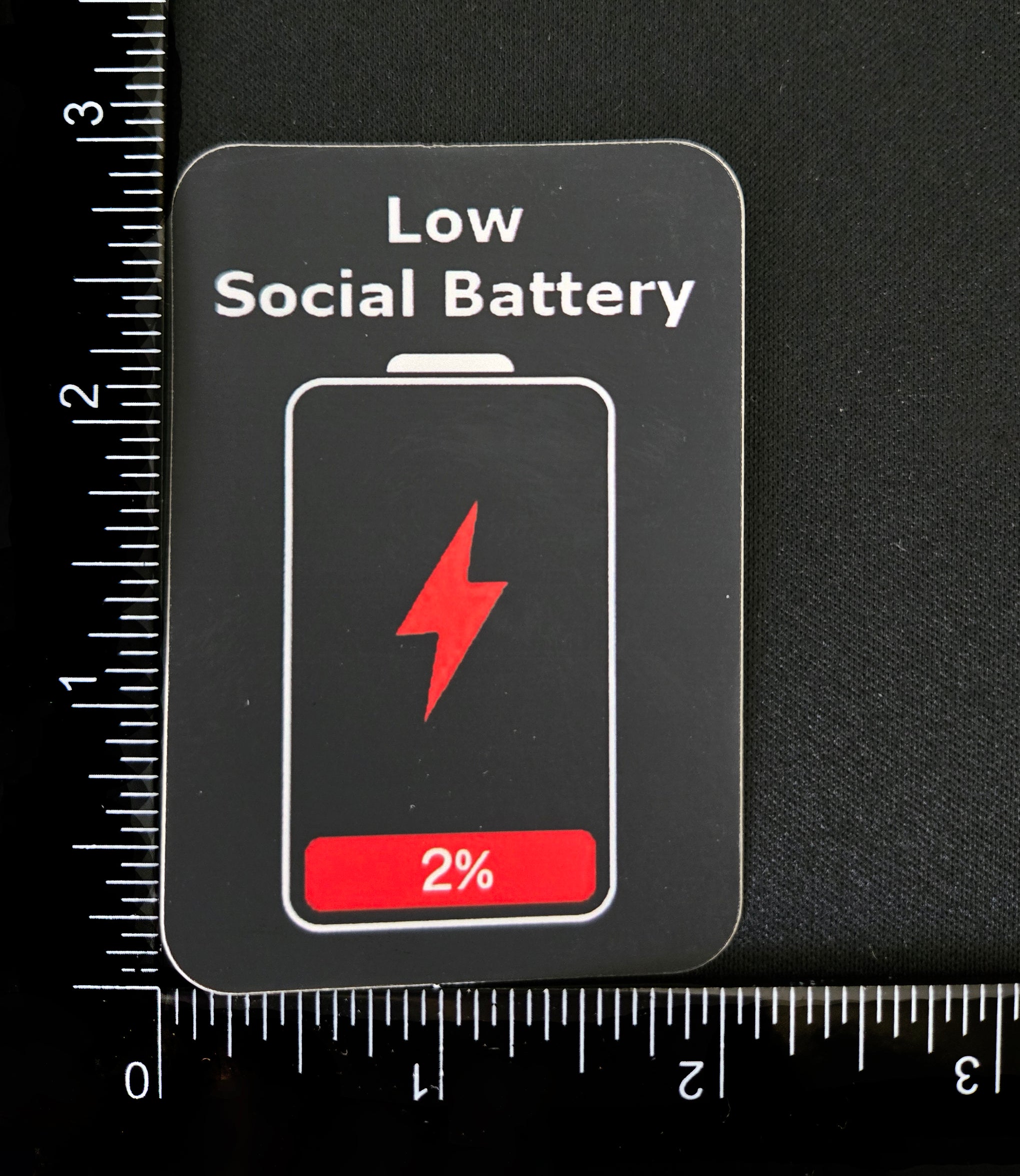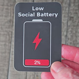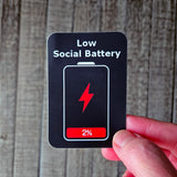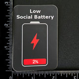 Perfectly capture your energy levels with this relatable "Low Social Battery" vinyl sticker. Perfect for introverts, socially drained souls, and anyone who needs a humorous way to express when they're running on empty. This clever design features a sleek phone battery icon at 2% with a bold red lightning bolt, all on a clean black background.