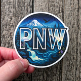 This sticker is ideal for outdoor enthusiasts, hikers, campers, nature lovers, or anyone who calls the Pacific Northwest home. The detailed illustration features classic PNW elements including towering mountains, wildlife silhouettes, and the region's iconic evergreen trees.