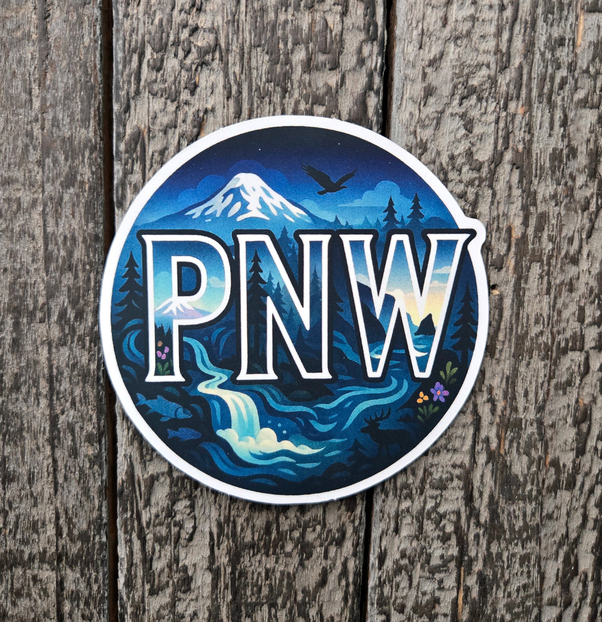 Round PNW - Celebrate the wild beauty of the Pacific Northwest with this stunning circular vinyl sticker! This design captures the essence of PNW life with a majestic snow-capped mountain, soaring eagle, flowing river, and dense evergreen forest all wrapped in rich blues and teals.
