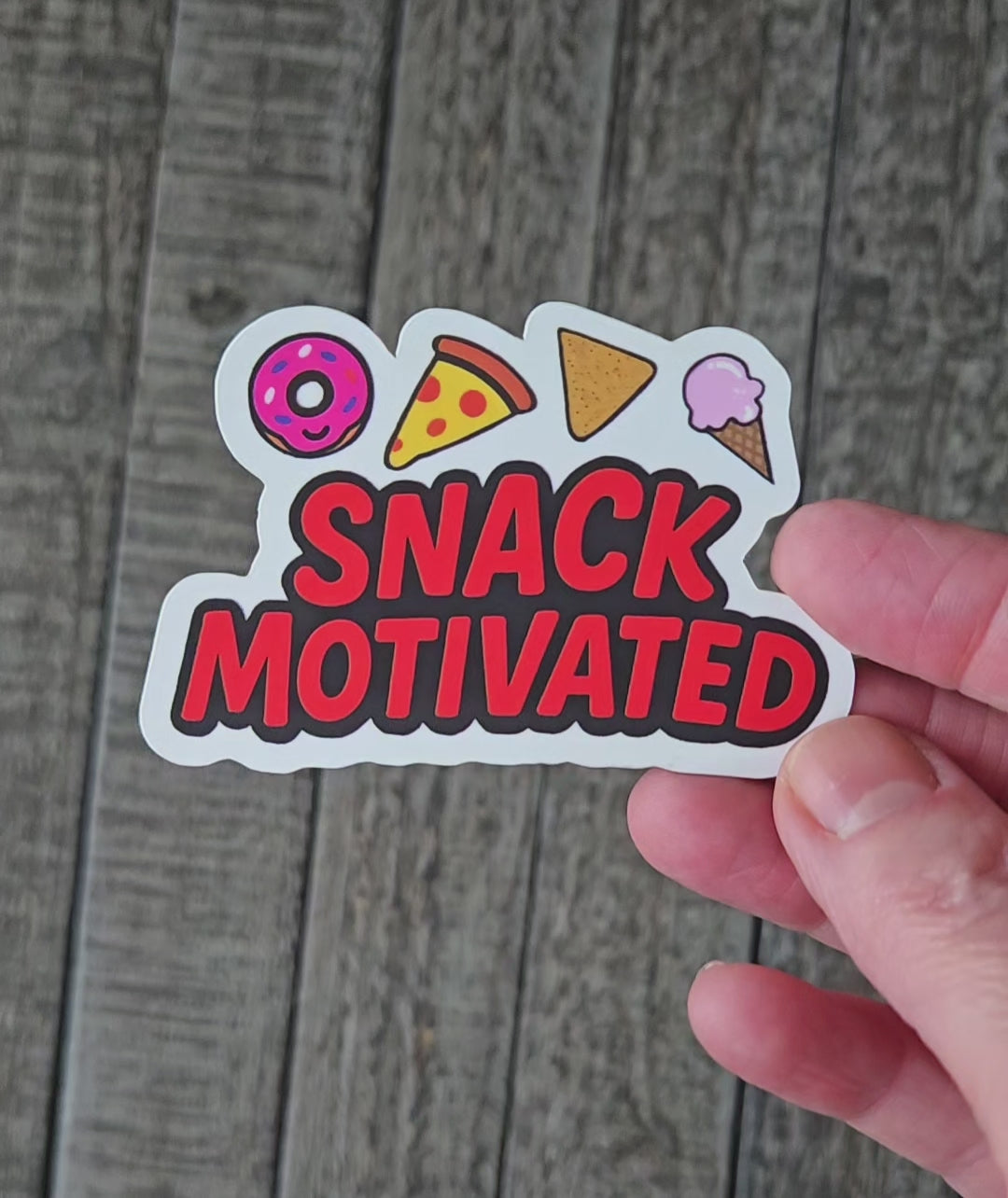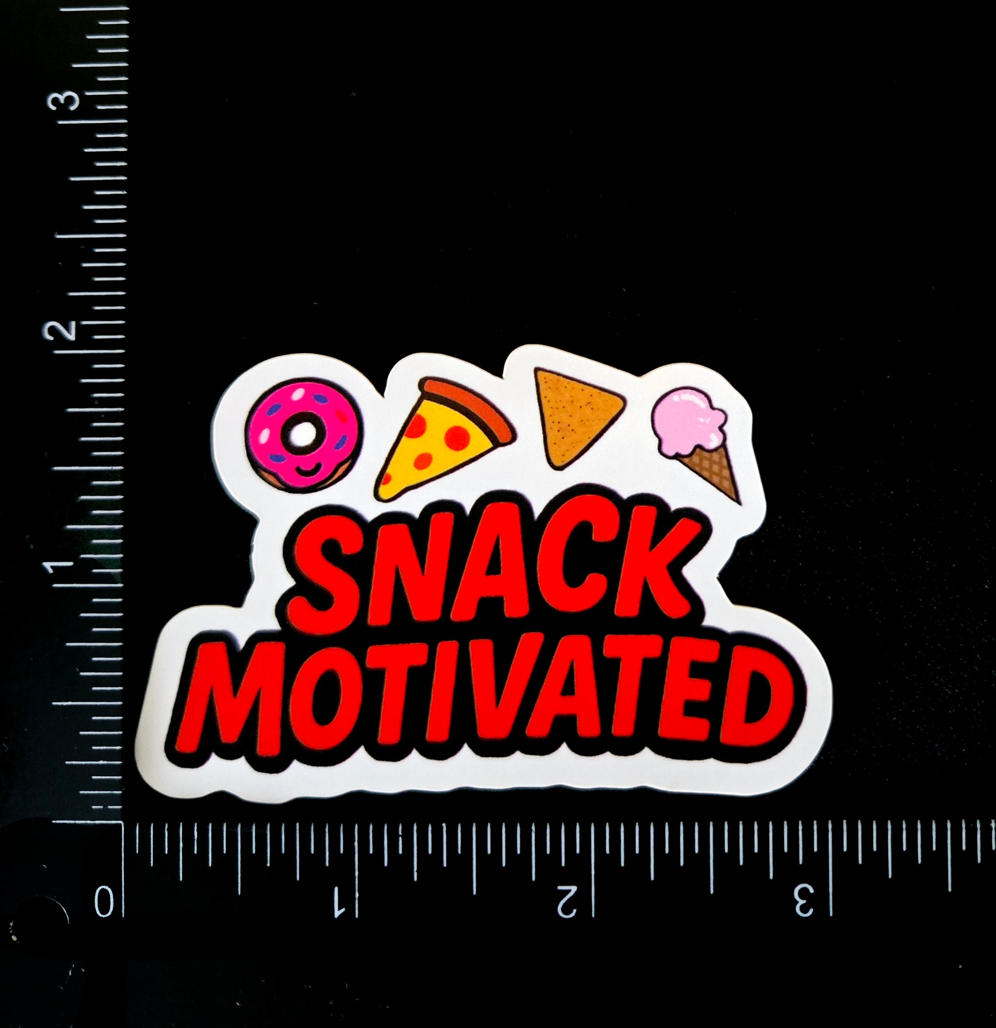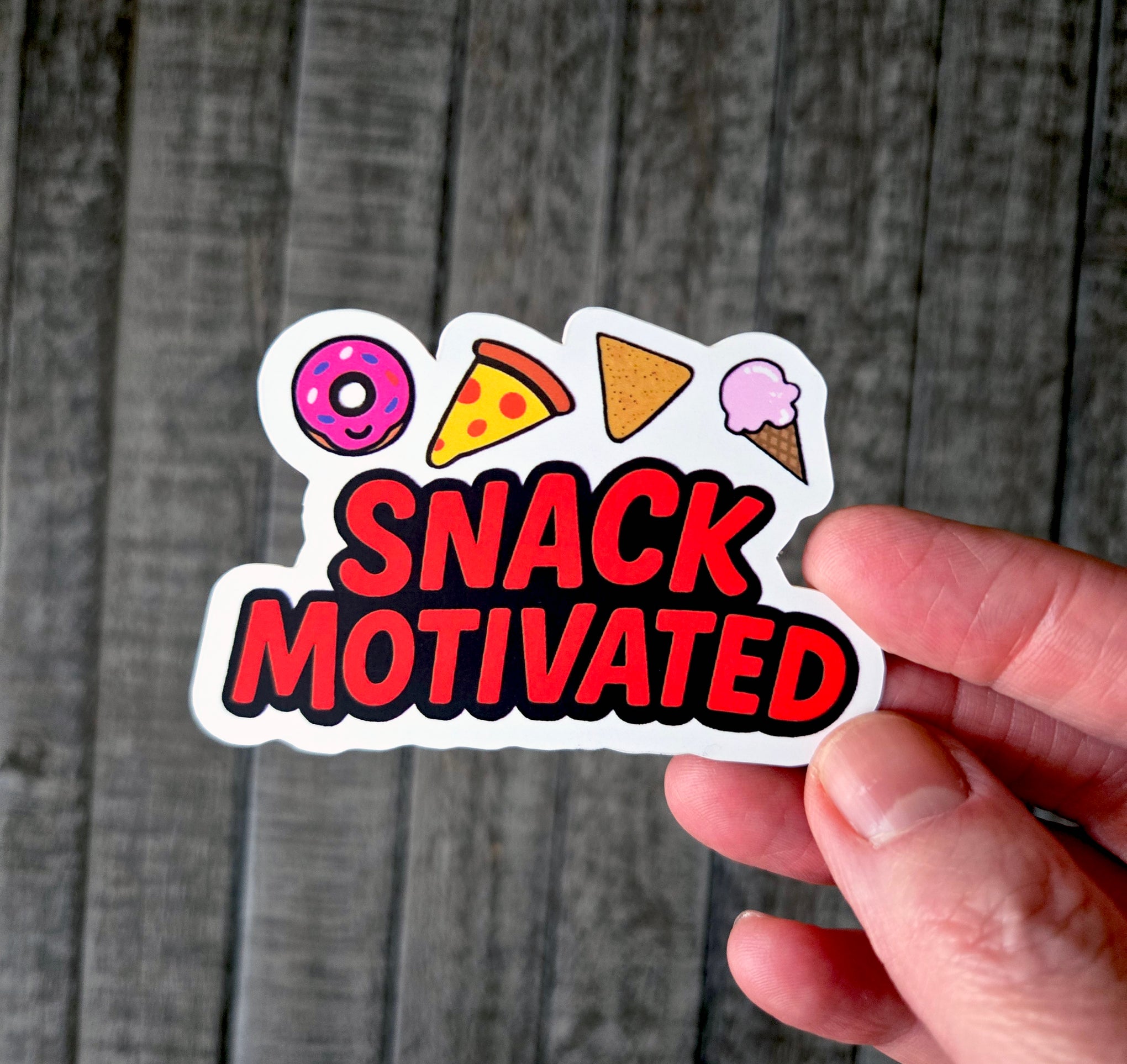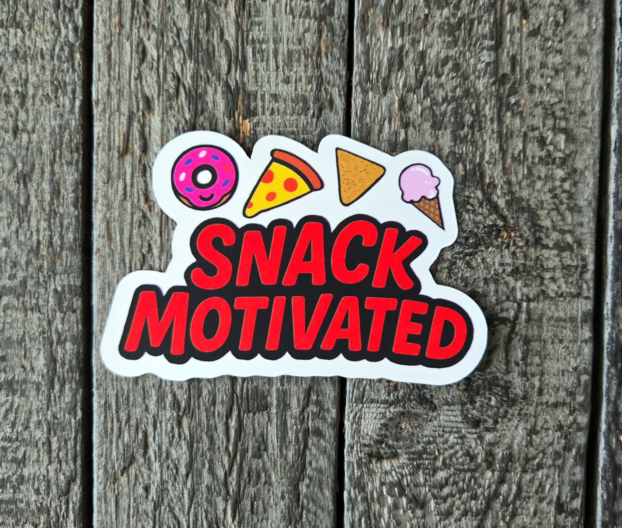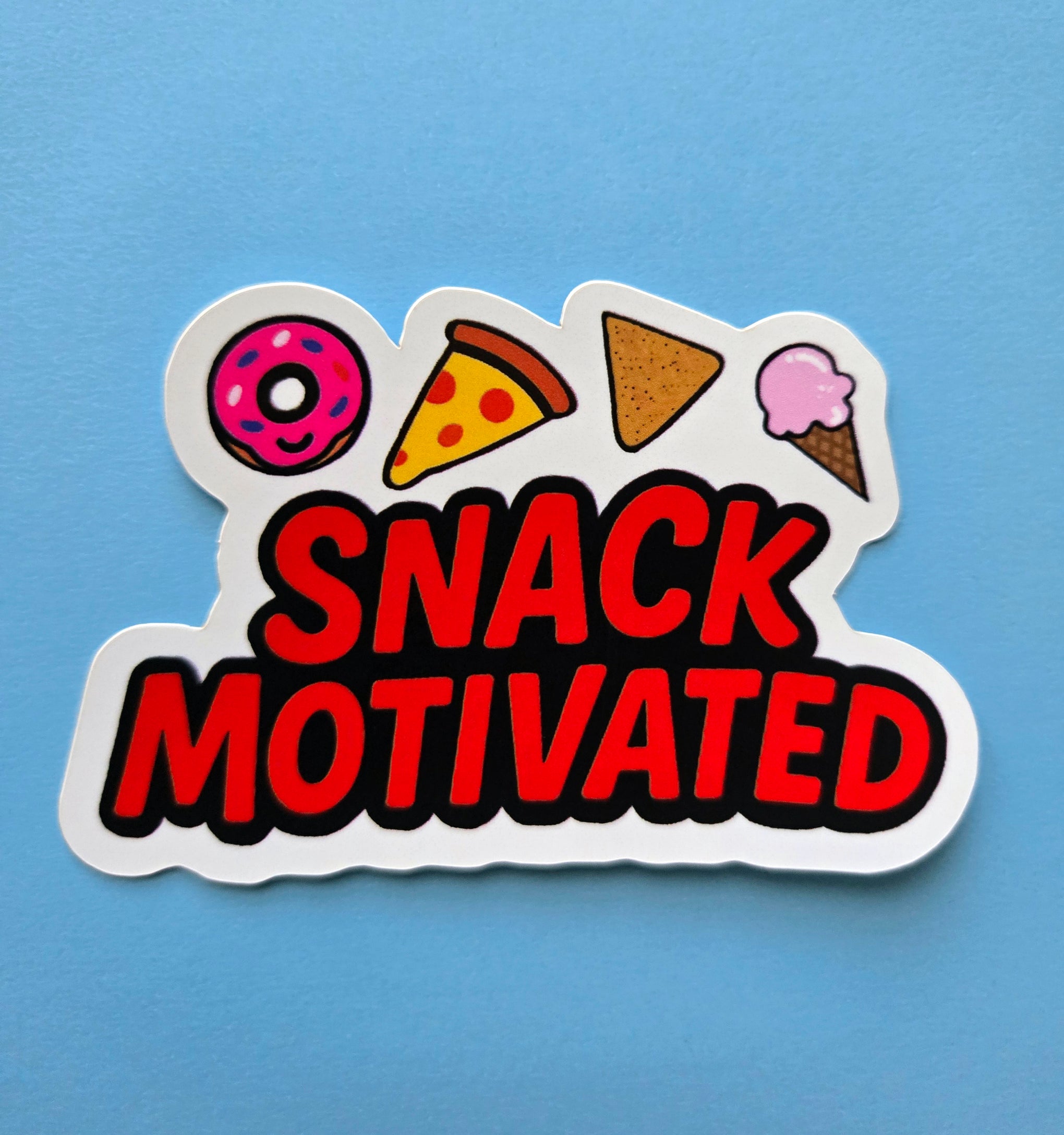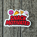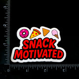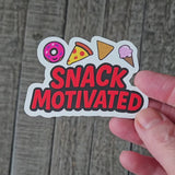 Fuel your snack obsession with this adorable "Snack Motivated" vinyl sticker. Perfect for fellow food lovers who know that the best motivation comes from thinking about your next delicious treat. This vibrant vinyl sticker features cute cartoon versions of everyone's favorite snacks; a pink frosted donut, cheesy pizza slice, crunchy nacho and a sweet ice cream cone.