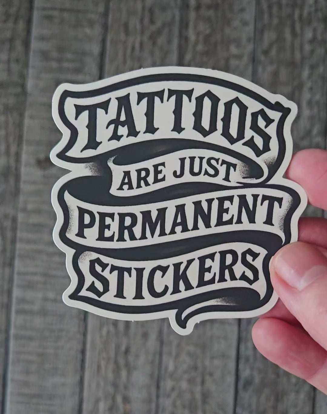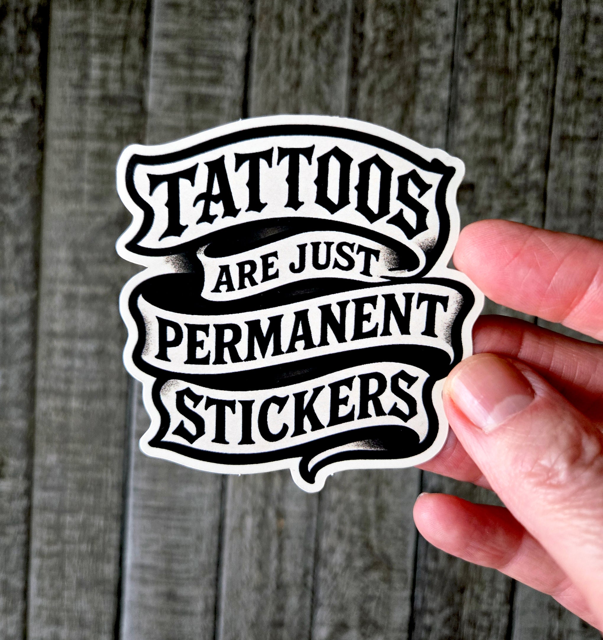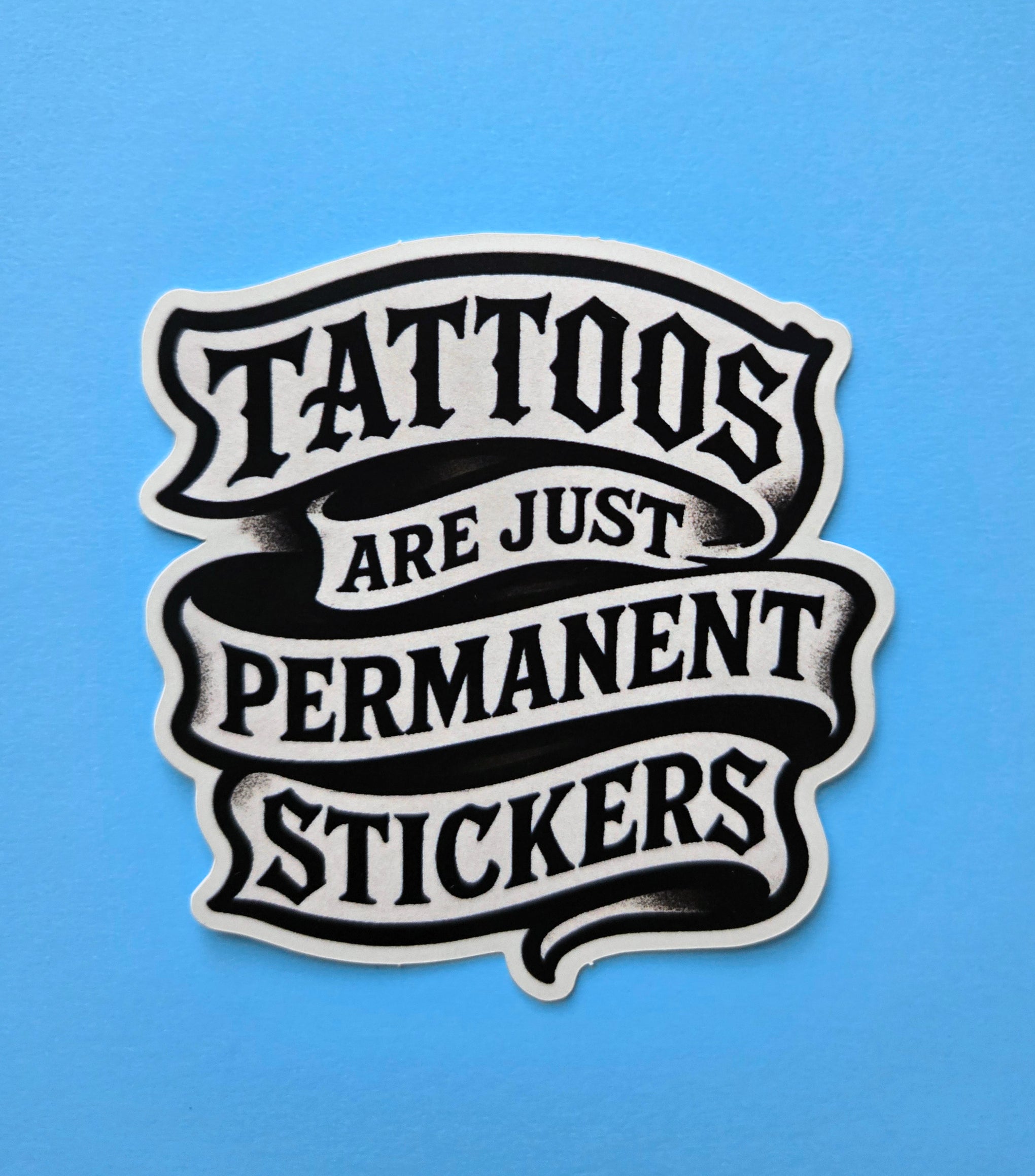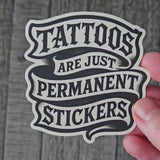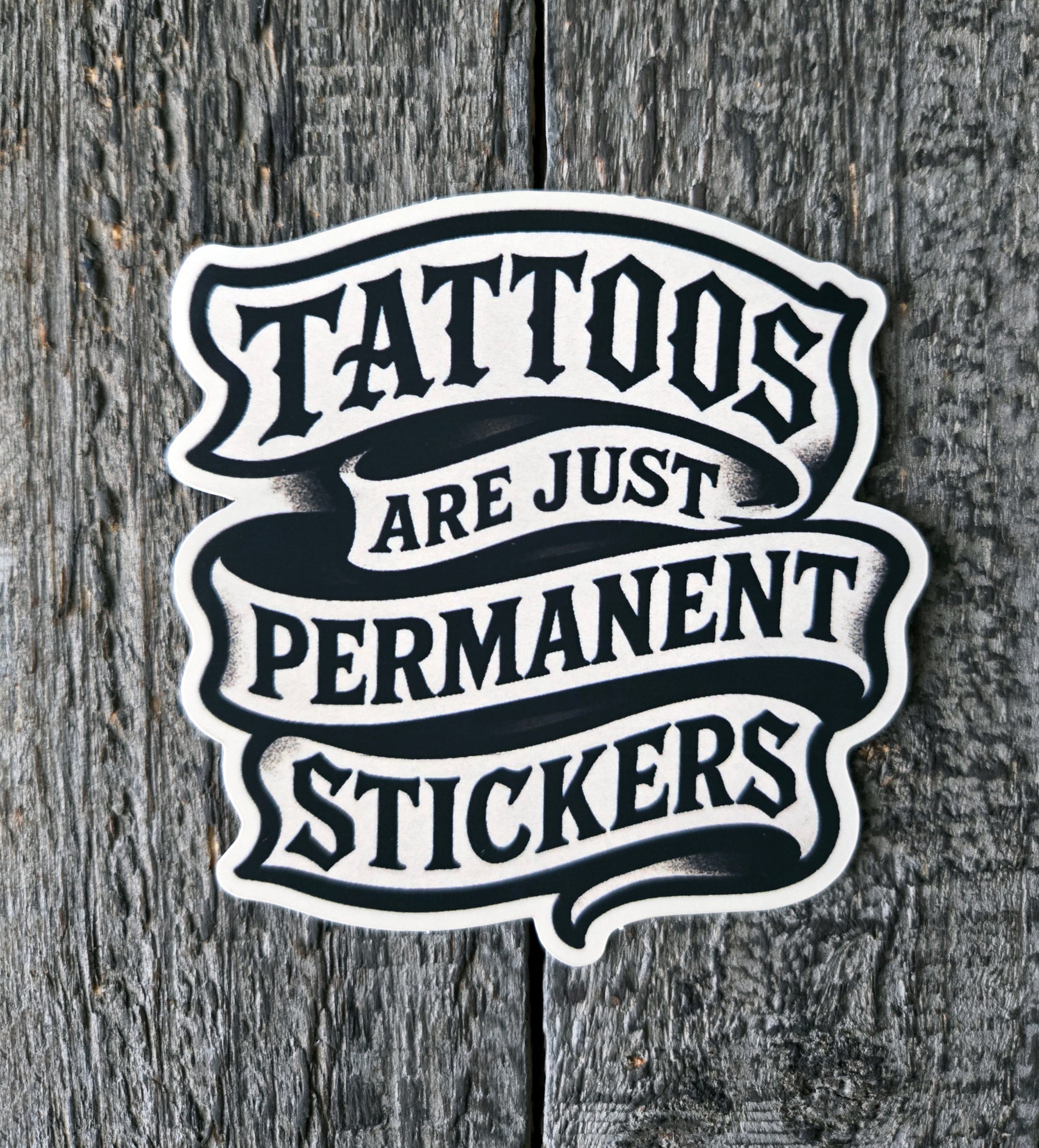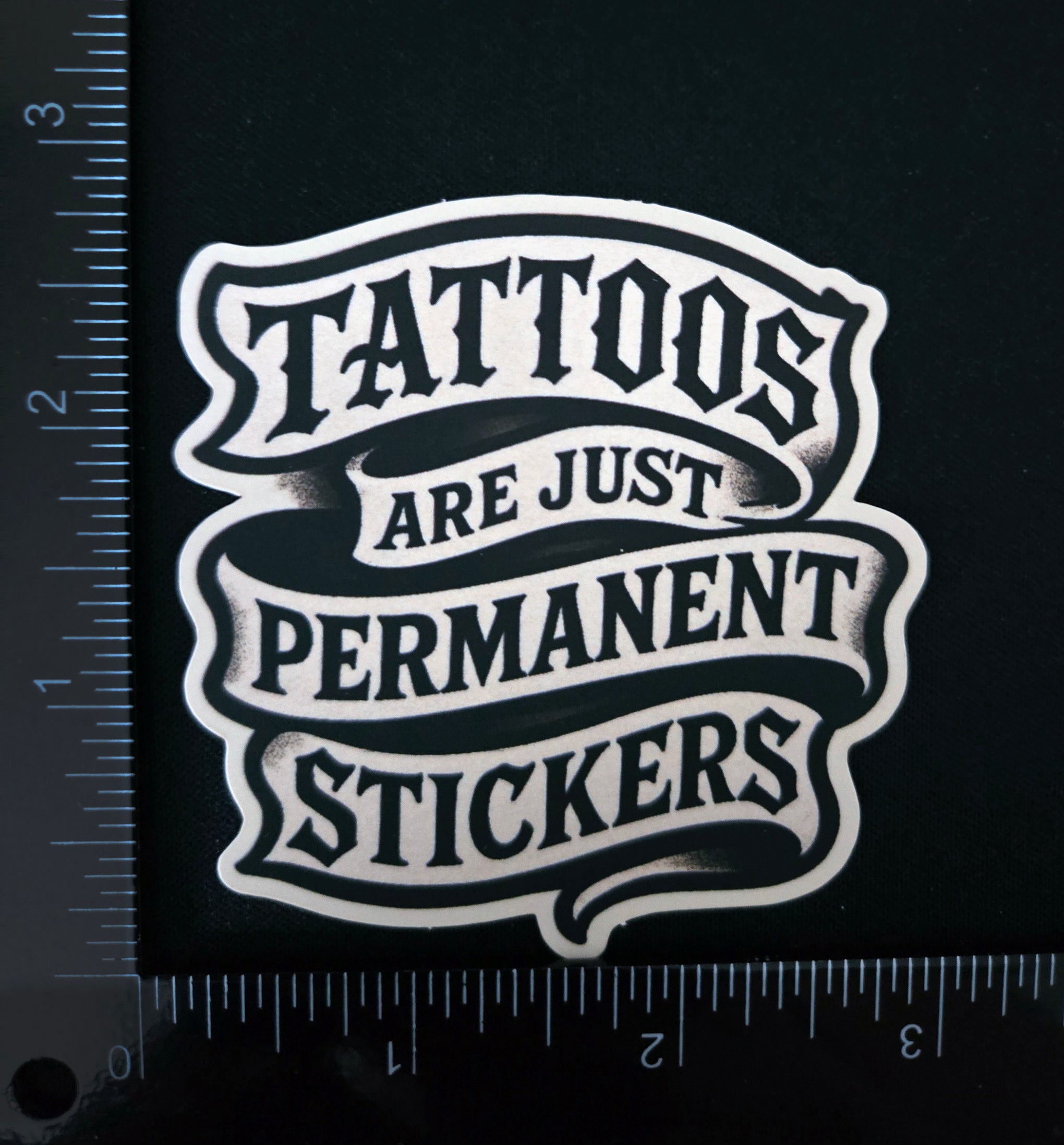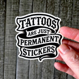 This premium vinyl sticker features bold vintage-style lettering with the phrase "TATTOOS ARE JUST PERMANENT STICKERS" in classic black text on a cream background. The design has a timeless banner aesthetic that looks great anywhere you stick it.