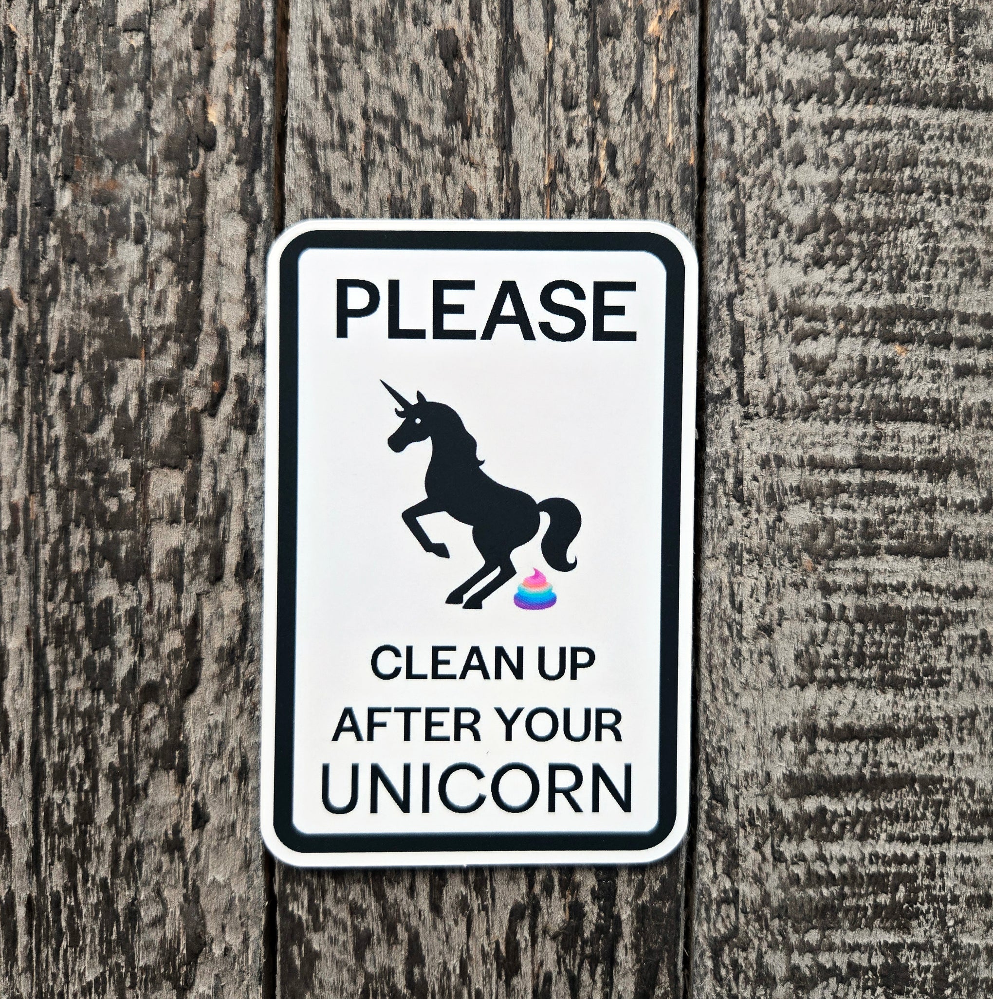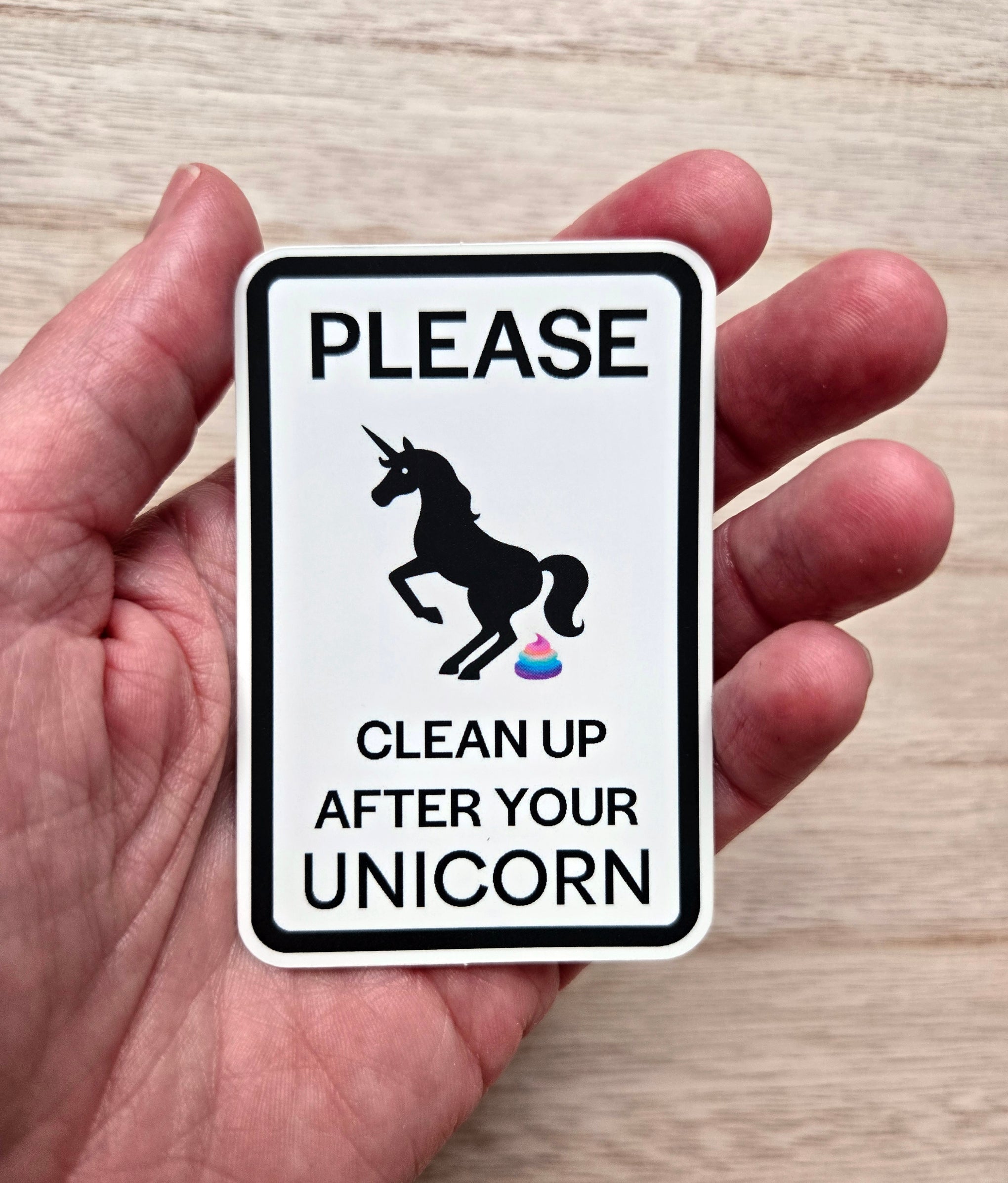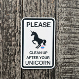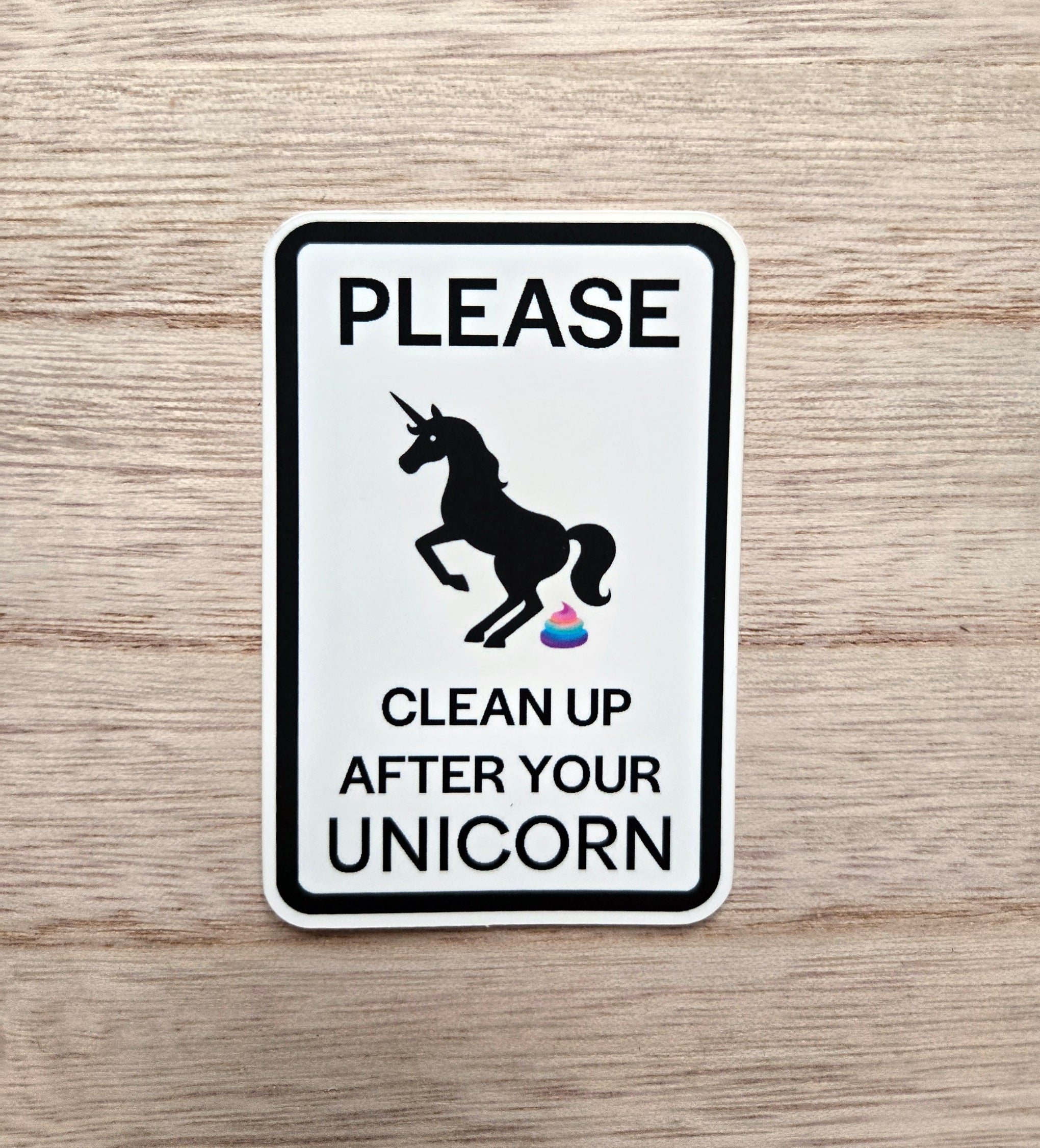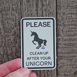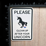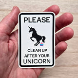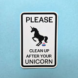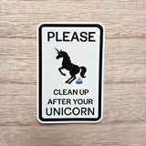 Unicorn Sticker Sign - If you believe in magic but also appreciate bathroom humor, this unicorn sticker is absolutely perfect for you! "Please clean up after your unicorn" brings a hilarious dose of reality to the mythical world - because even magical creatures need to follow house rules.