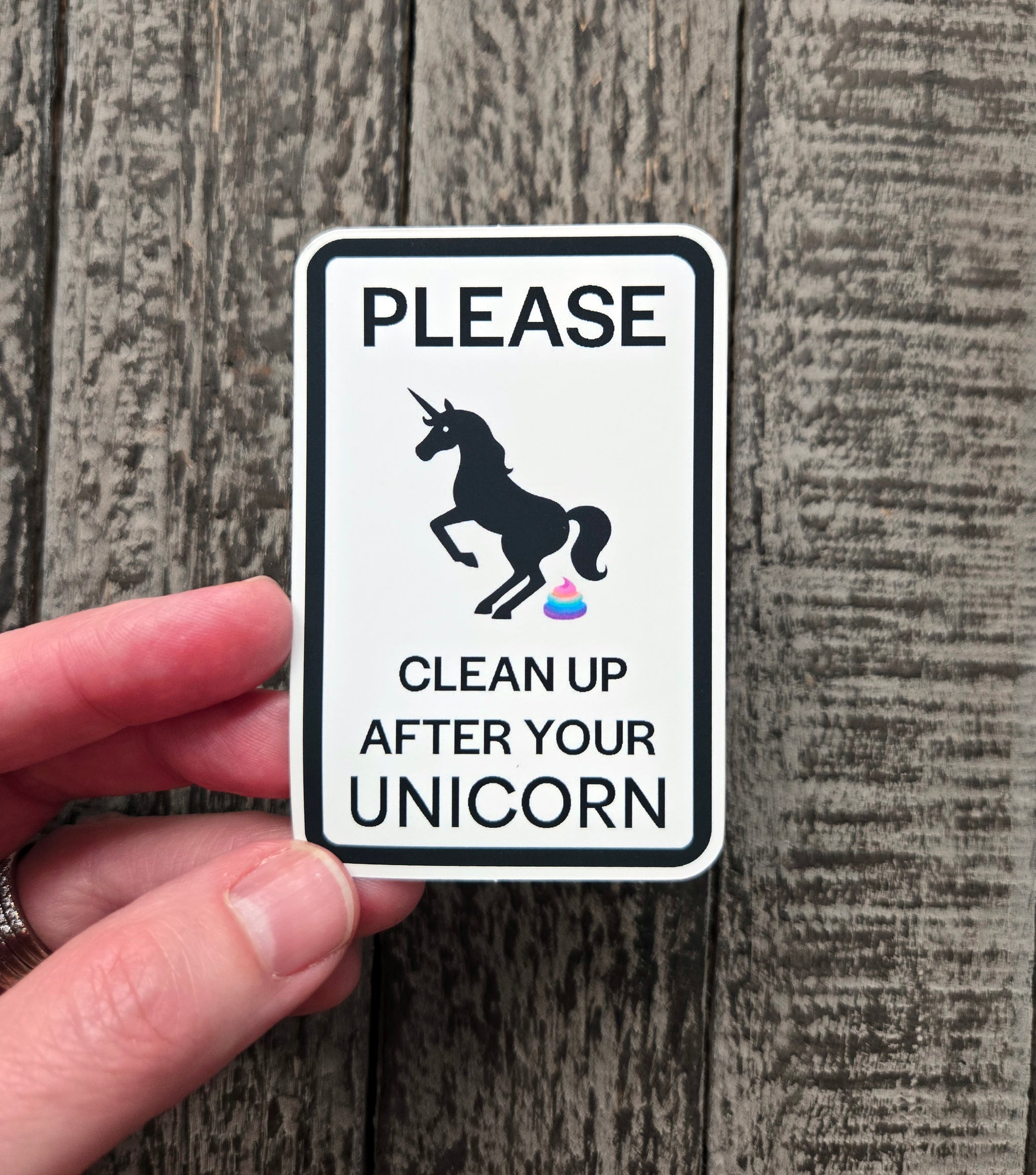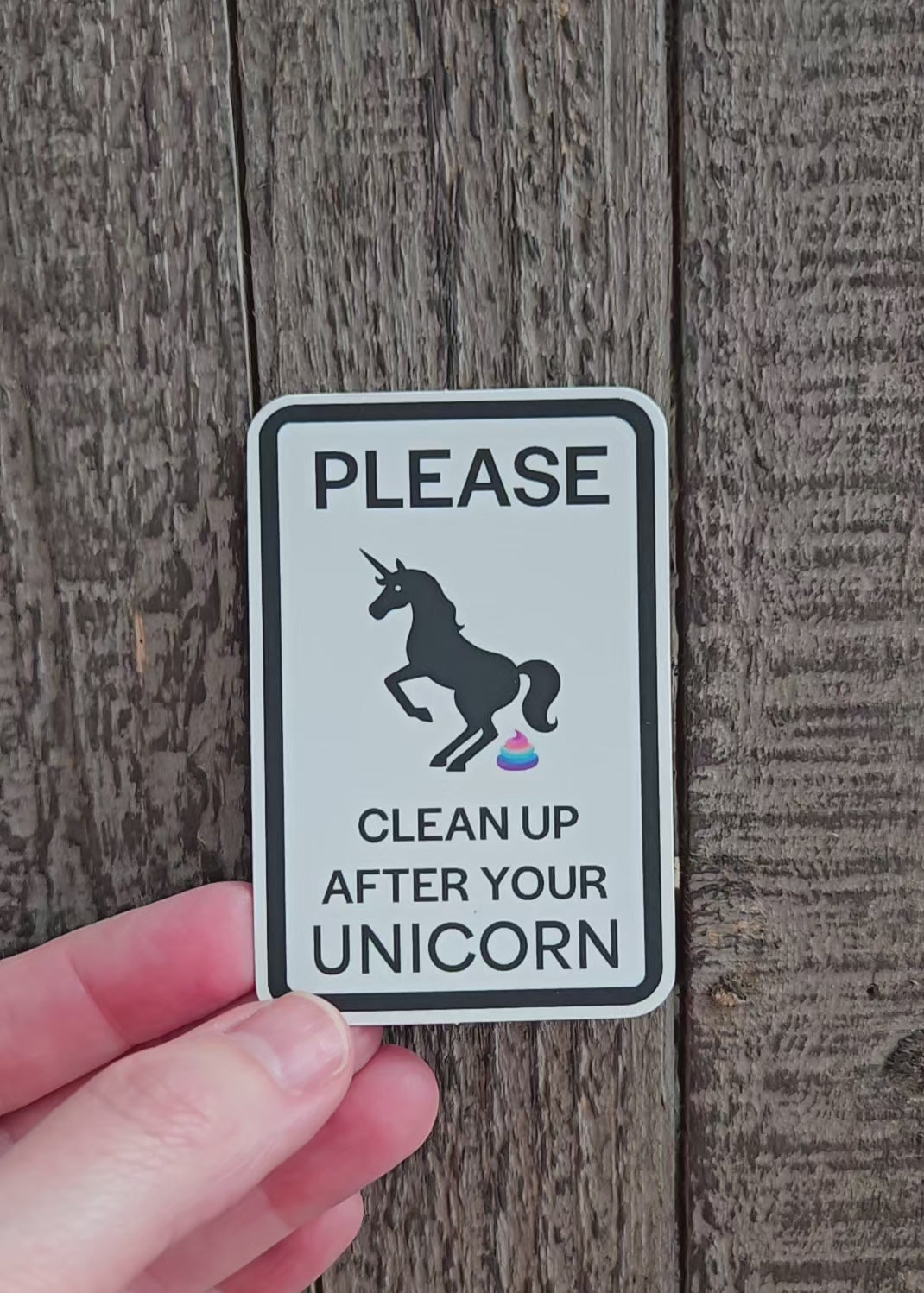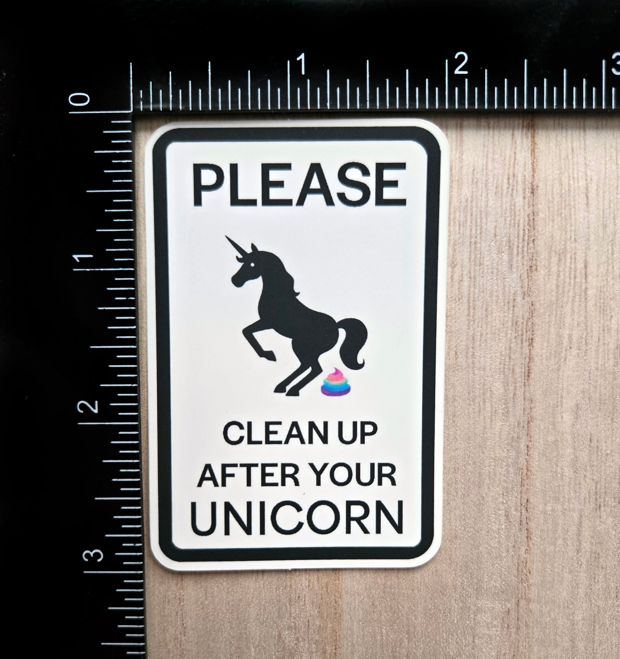 Unicorn Sticker Sign - If you believe in magic but also appreciate bathroom humor, this unicorn sticker is absolutely perfect for you! "Please clean up after your unicorn" brings a hilarious dose of reality to the mythical world - because even magical creatures need to follow house rules.