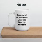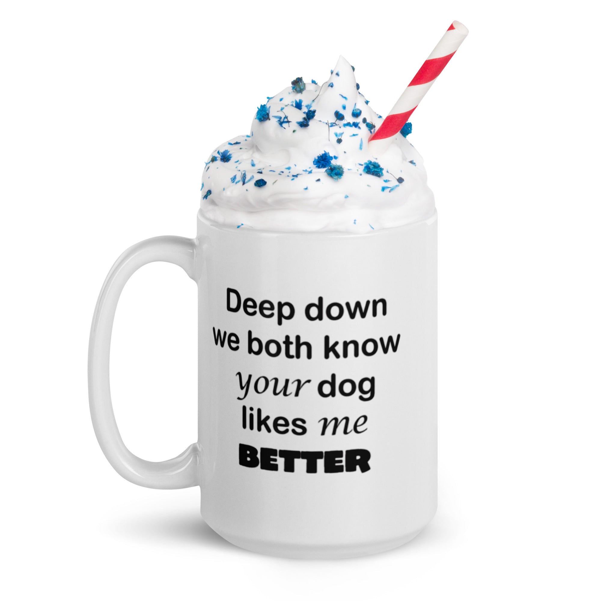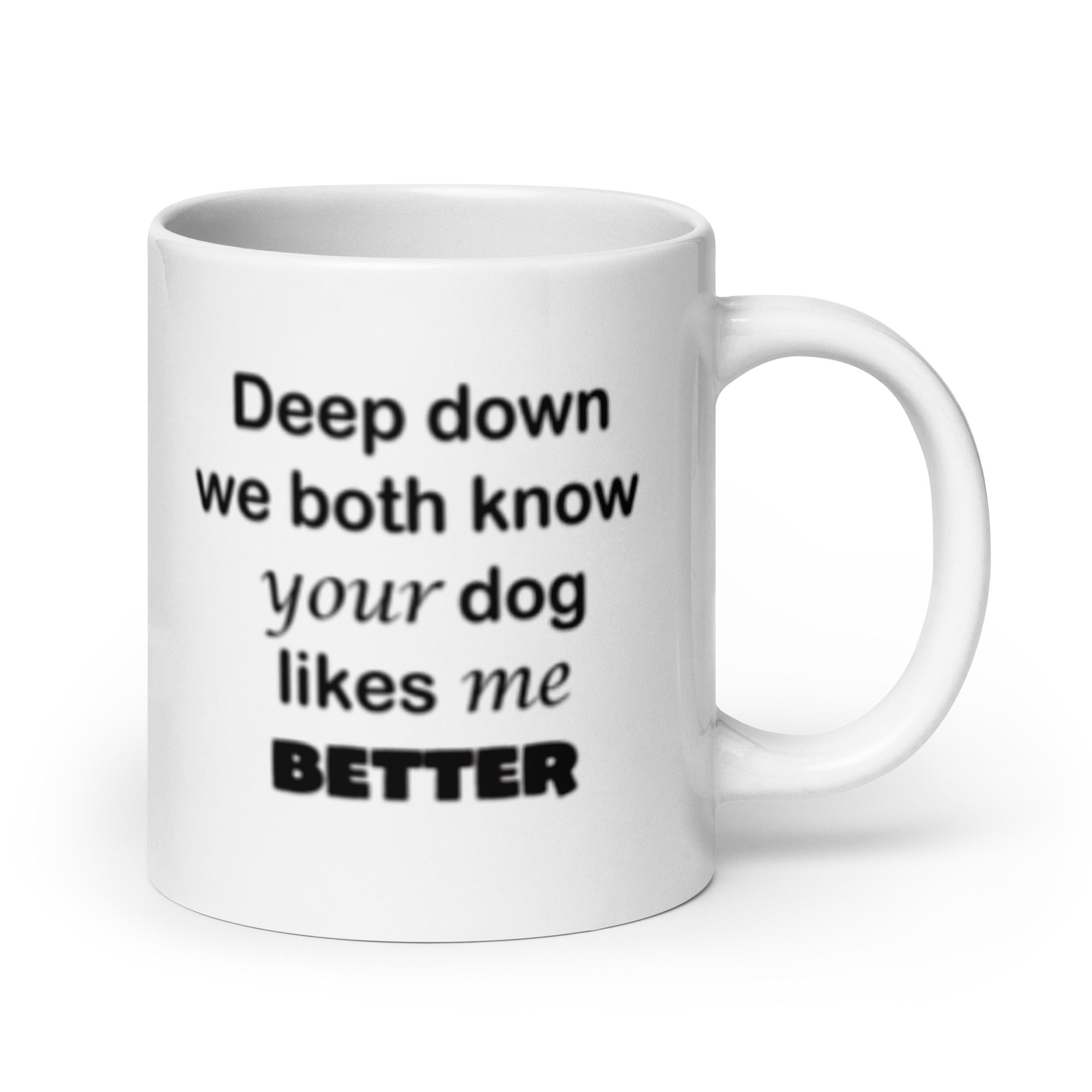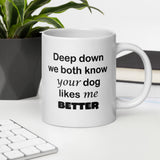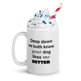 Your Dog Likes Me Better Coffee Mug - "Deep down we both know your dog likes me BETTER." This hilarious coffee mug speaks the truth every dog owner secretly fears. The design appears on both the front and back of the mug, so this delightful betrayal is visible from every angle. Perfect for the friend, family member, or dog sitter who's suspiciously good at getting tail wags.